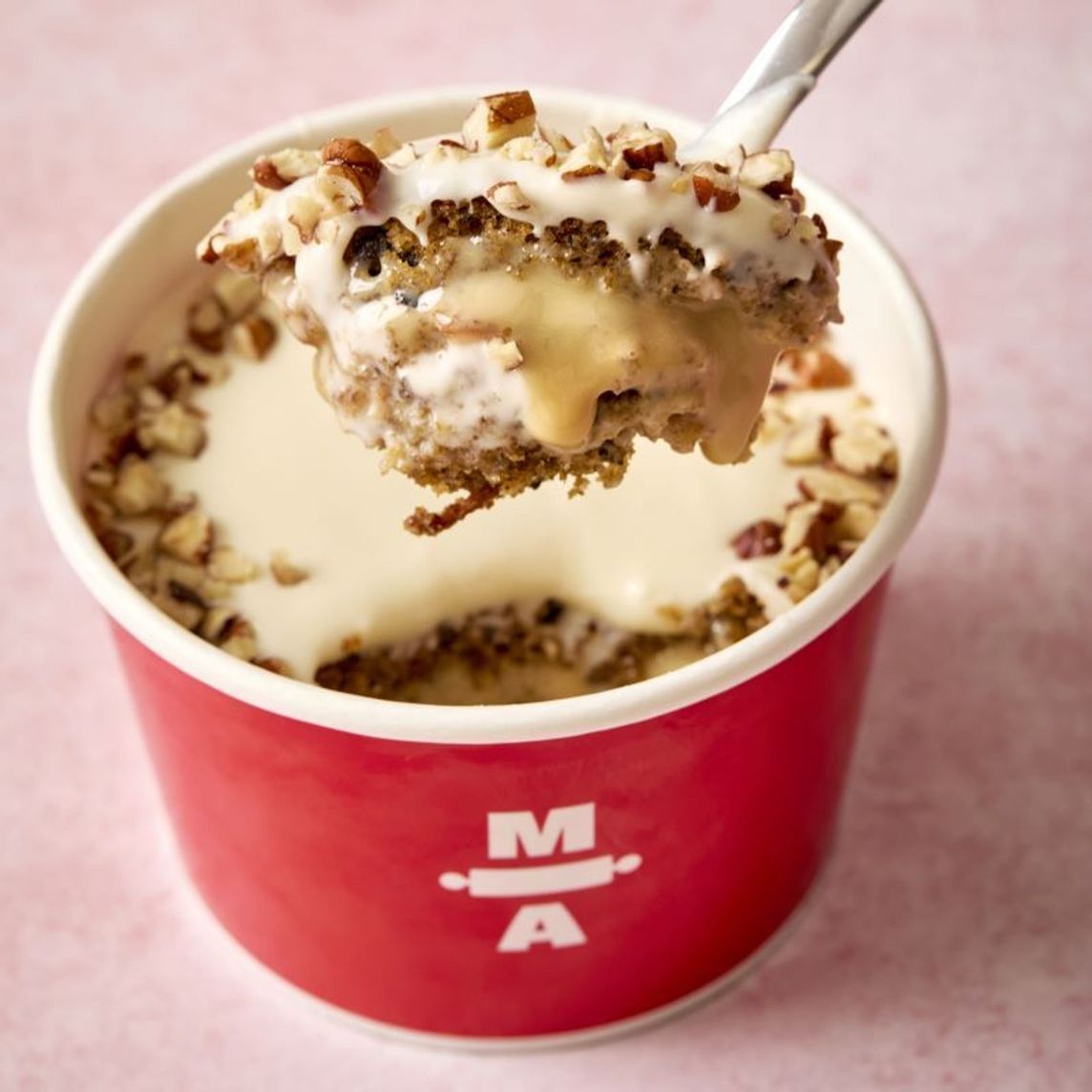 Harina integral, panela y zanahoria, bañada en frosting de queso crema y pecanas molidas.