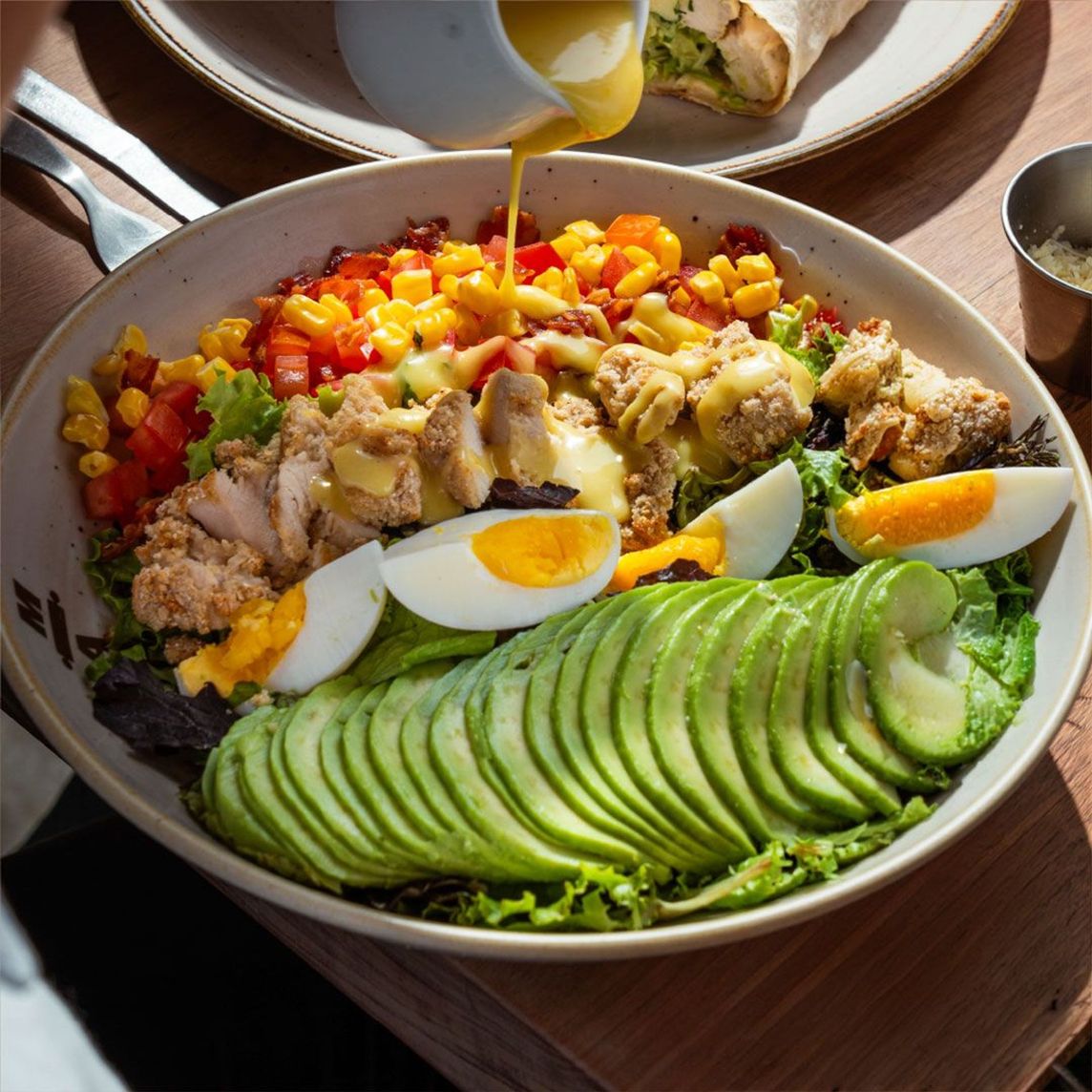 Ensalada con pollo crispy, huevo duro, queso, palta, tocino crocante, choclo americano, tomate, mix de lechugas y honey mustard.