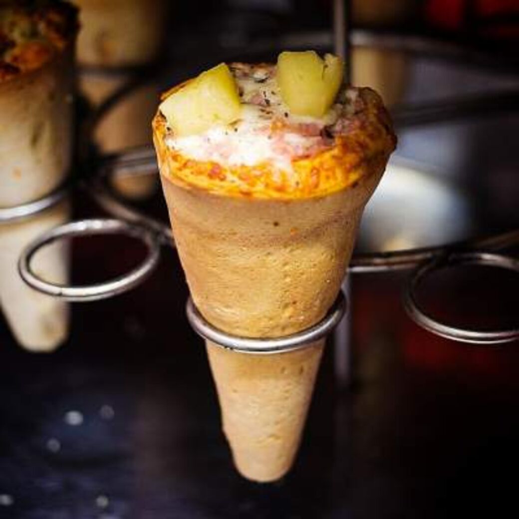 4 pizzas en cono power con salsa de tomate, mozzarella, relleno a elección(el relleno de cada pizza n cono cubre una pizza mediana de 21 cm).