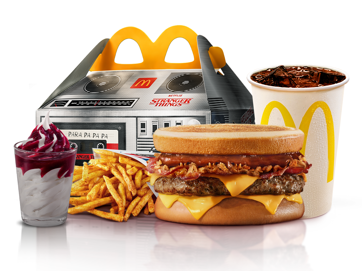 01 hamburguesa de carne "Stranger Burger Sandwich", 1 papas "The Upside Down Fries", 1 helado "Scoops sundae" de frutos rojos y 1 gaseosa mediana de 16 oz. La gaseosa viene con hielo. Válida durante todo el mes. Stock: 3,000 unds. Imágenes referenciales. Los vasos no vienen brandeados.