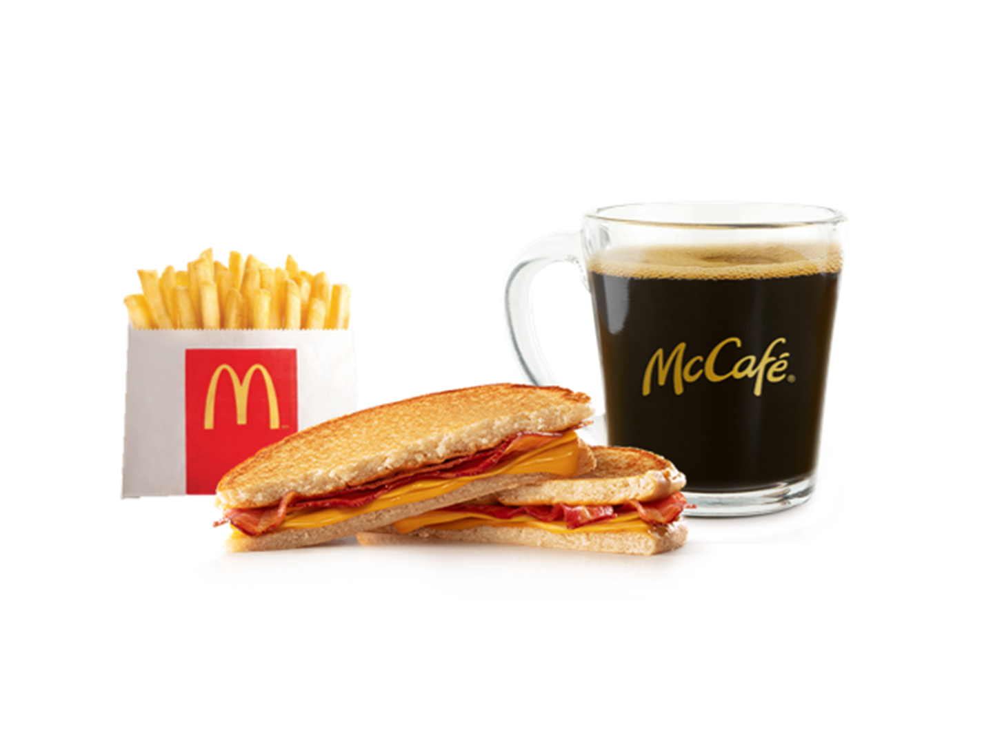Un sándwich tostado queso y tocino, unas papas regulares y un café. Válido durante el mes. Imagenes referenciales. Stock: 3,000 unds.