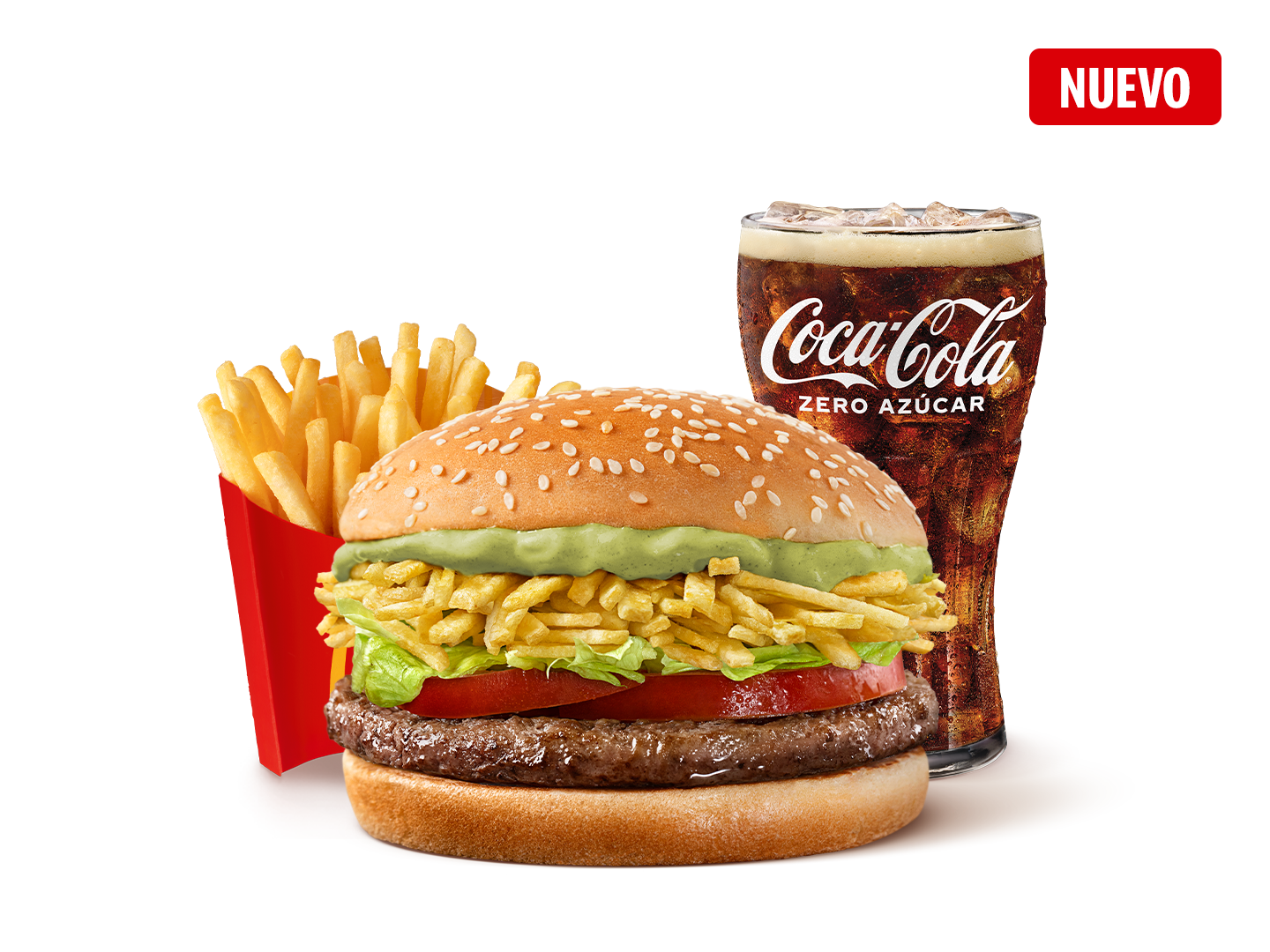 Hamburguesa "Grand Apaltada 1 carne", 1 papa mediana, 1 gaseosa mediana de 16 oz a elección. La bebida incluye hielo. El sándwich contiene: 1 carne de res, lechuga, 2 tomates, papas al hilo y salsa sabor a palta en pan con ajonjolí. Imagen referencial.