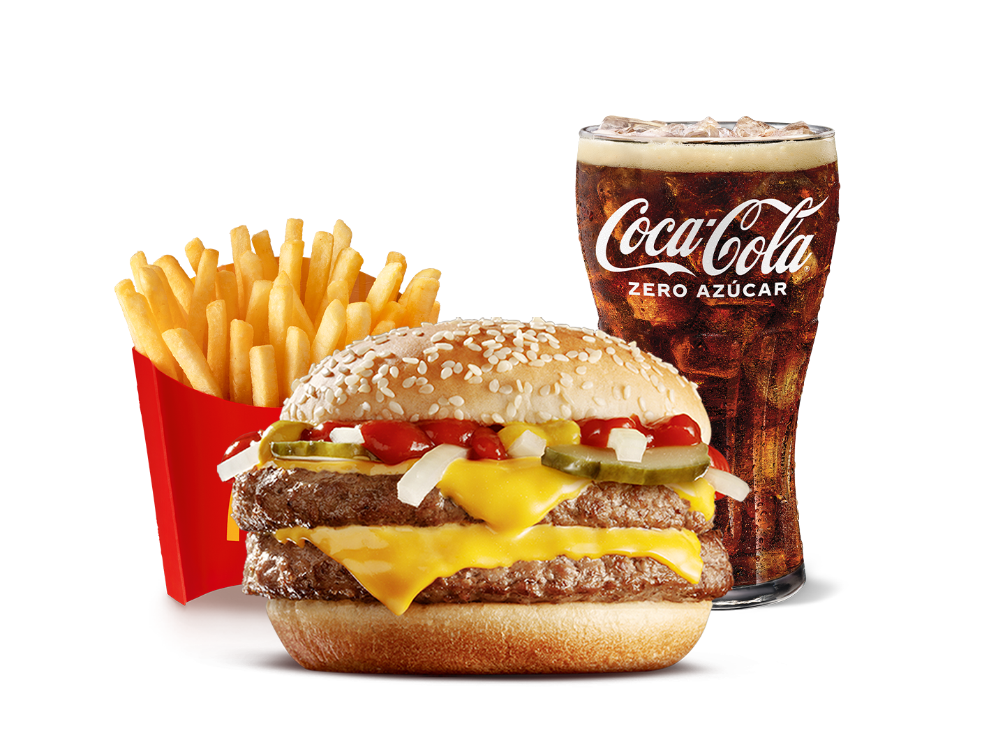 Hamburguesa doble carne de res, queso cheddar, pepinillos, lechuga, pan en centro, salsa Big Mac en pan con ajonjolí; con 1 papas medianas y 1 gaseosa mediana 16 oz, a elección. Imagen referencial.
