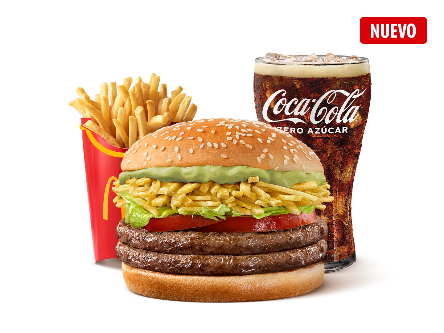Hamburguesa doble carne de res, queso cheddar, pepinillos, lechuga, pan en centro, salsa Big Mac en pan con ajonjolí; con 1 papas medianas y 1 gaseosa mediana 16 oz, a elección. Imagen referencial.