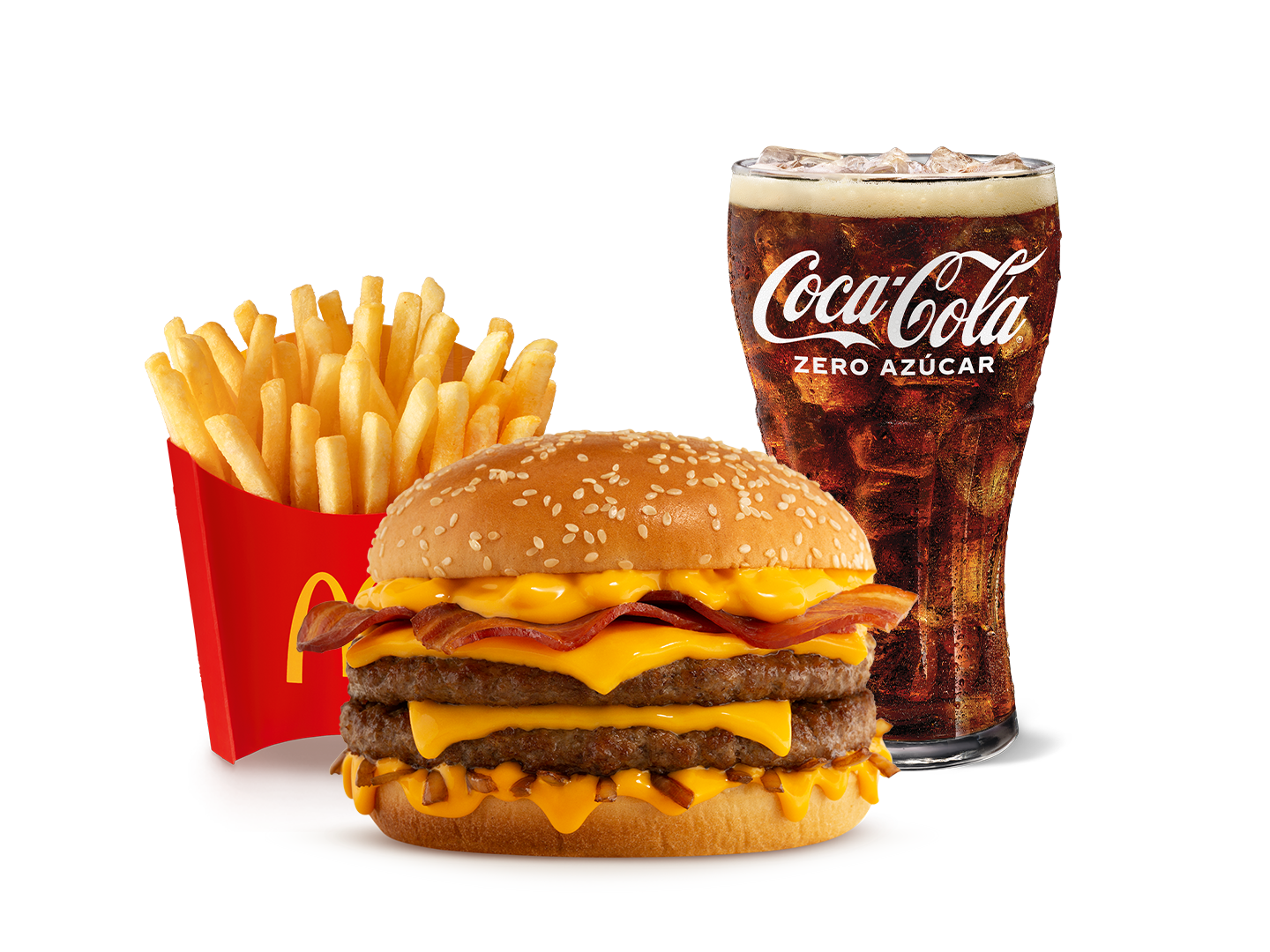 Hamburguesa doble carne de res, queso cheddar, pepinillos, lechuga, pan en centro, salsa Big Mac en pan con ajonjolí; con 1 papas medianas y 1 gaseosa mediana de 16 oz, a elección. Imagen referencial.