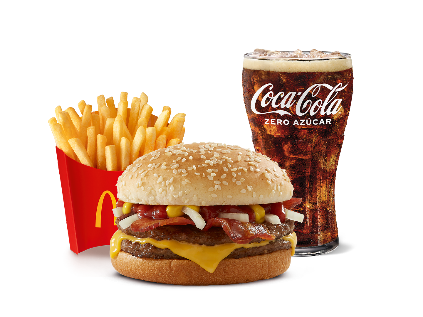Hamburguesa de doble carne de res, 2 tocinos en tiras, ketchup, mostaza, cebolla, queso cheddar en pan con ajonjolí; con 1 papas medianas y 1 gaseosa mediana 16 oz, a elección. Imagen referencial.