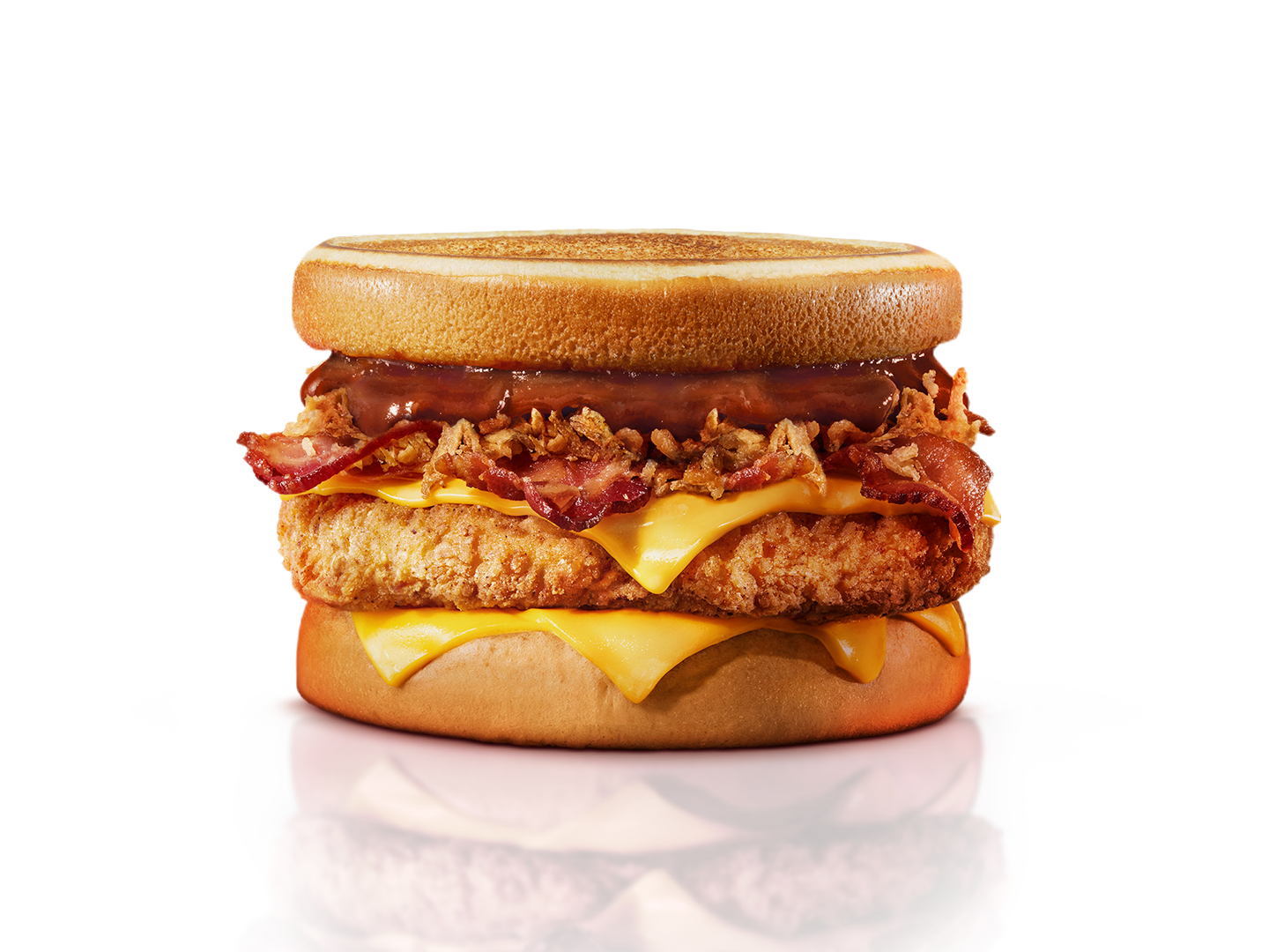 Hamburguesa de dos carnes de res, salsa cheddar, dos tiras de tocino, dos quesos cheddar, cebolla grillada en pan 4.5" con ajonjolí. Imagen referencial.