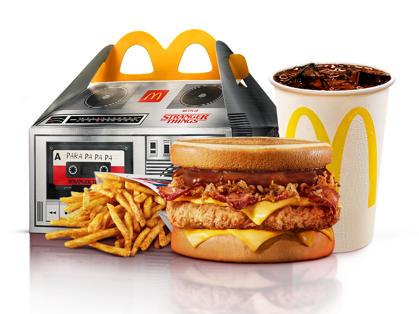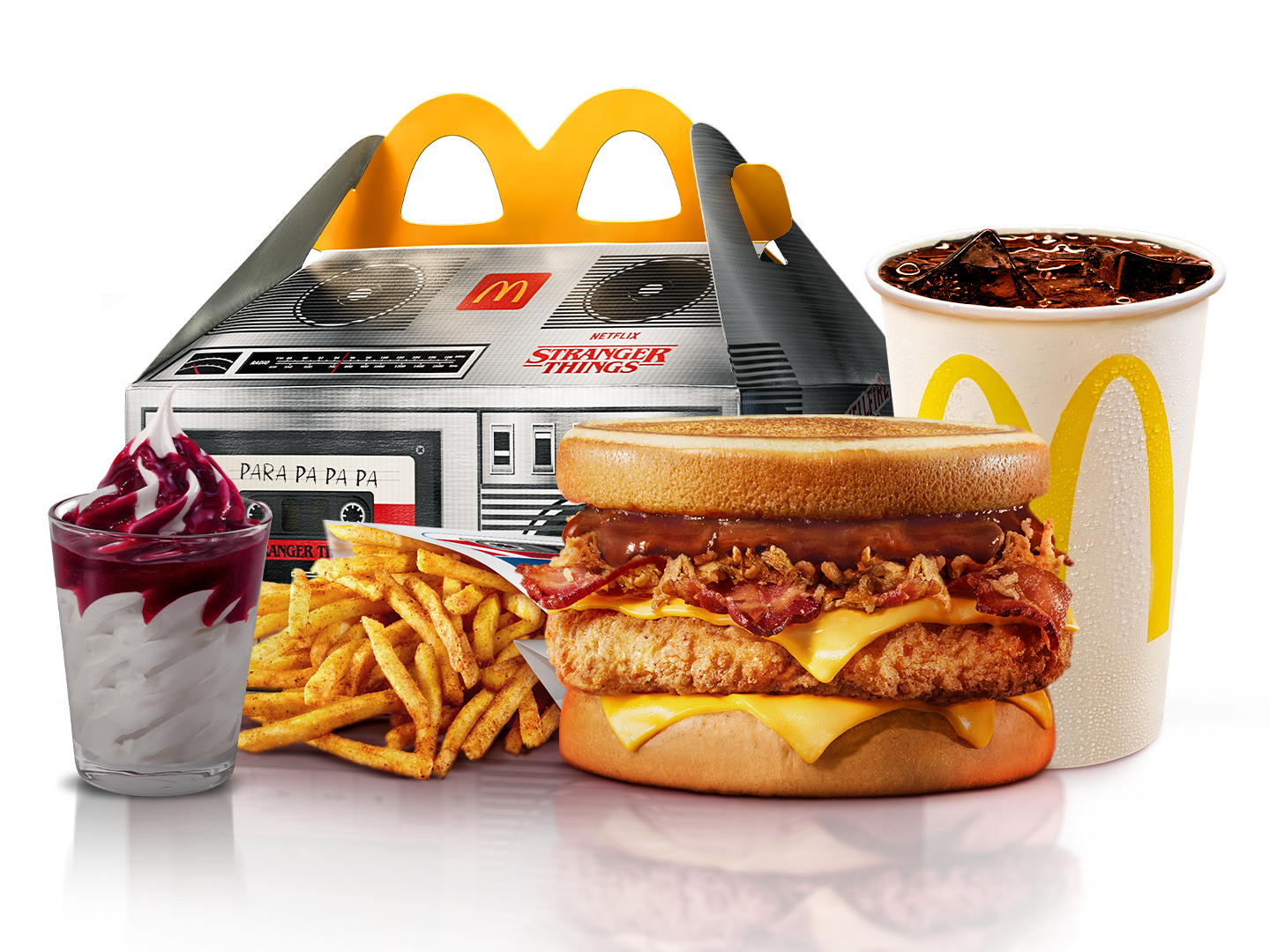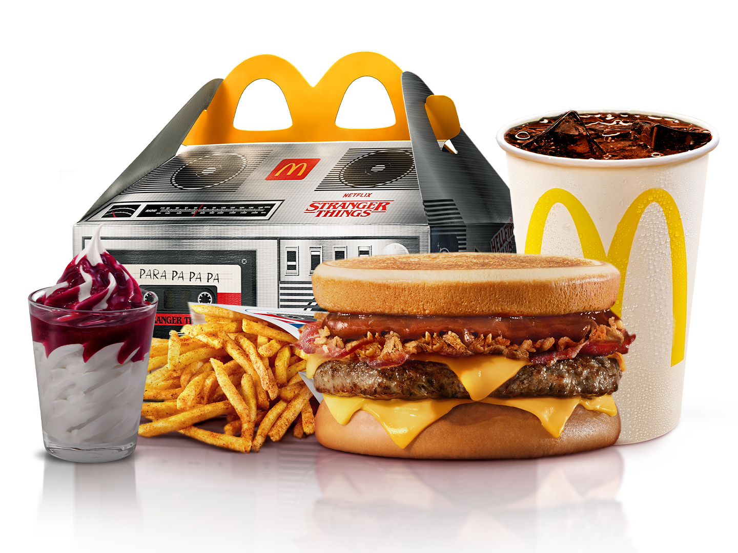 01 hamburguesa de pollo "Stranger Burger Sandwich", 1 papas "The Upside Down Fries", 1 helado "Scoops sundae" de frutos rojos y 1 gaseosa mediana de 16 oz. La gaseosa viene con hielo. Válida durante todo el mes. Stock: 3,000 unds. Imágenes referenciales. Los vasos no vienen brandeados.