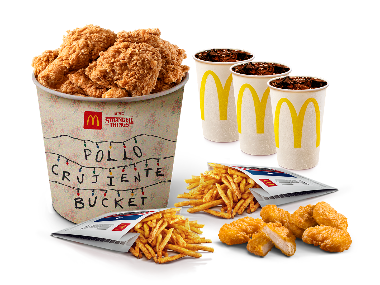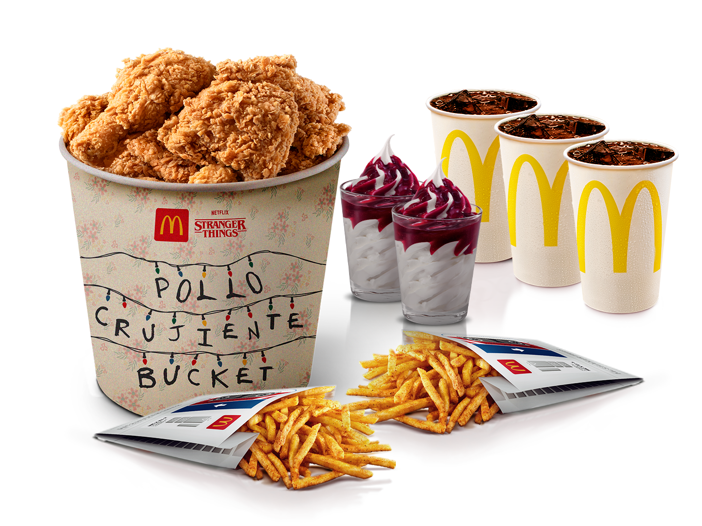 6 piezas de pollo crujiente, 2 papas "The Upside Down Fries" y 2 helados "Scoops sundae" de frutos rojos. Sujeto a stock disponible en tienda. Las piezas de pollo son aleatorios y sujetos a stock. Válido durante el mes. Imagenes referenciales.El bucket no aplica para local de La Molina.