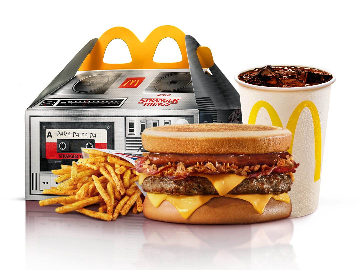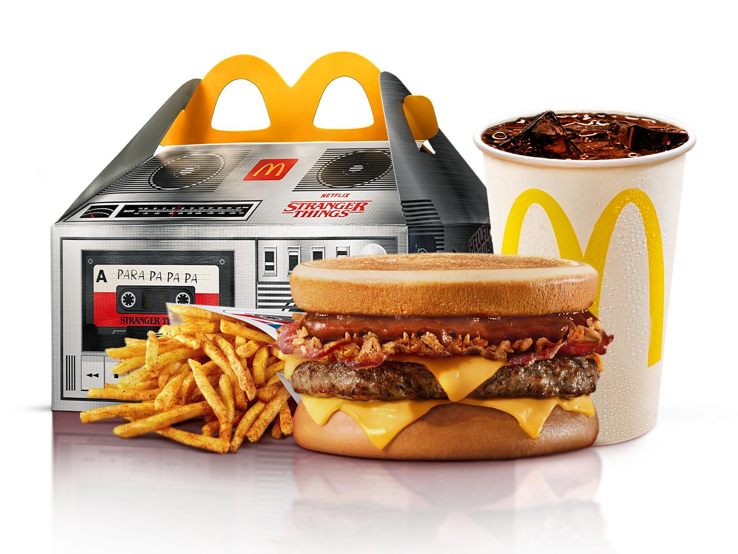 01 hamburguesa de carne "Stranger Burger Sandwich", 1 papas "The Upside Down Fries", 1 helado "Scoops sundae" de frutos rojos y 1 gaseosa grande de 16 oz. La gaseosa viene con hielo. Válida durante todo el mes. Stock: 3,000 unds. Imágenes referenciales. Los vasos no vienen brandeados. Los vasos no vienen brandeados.