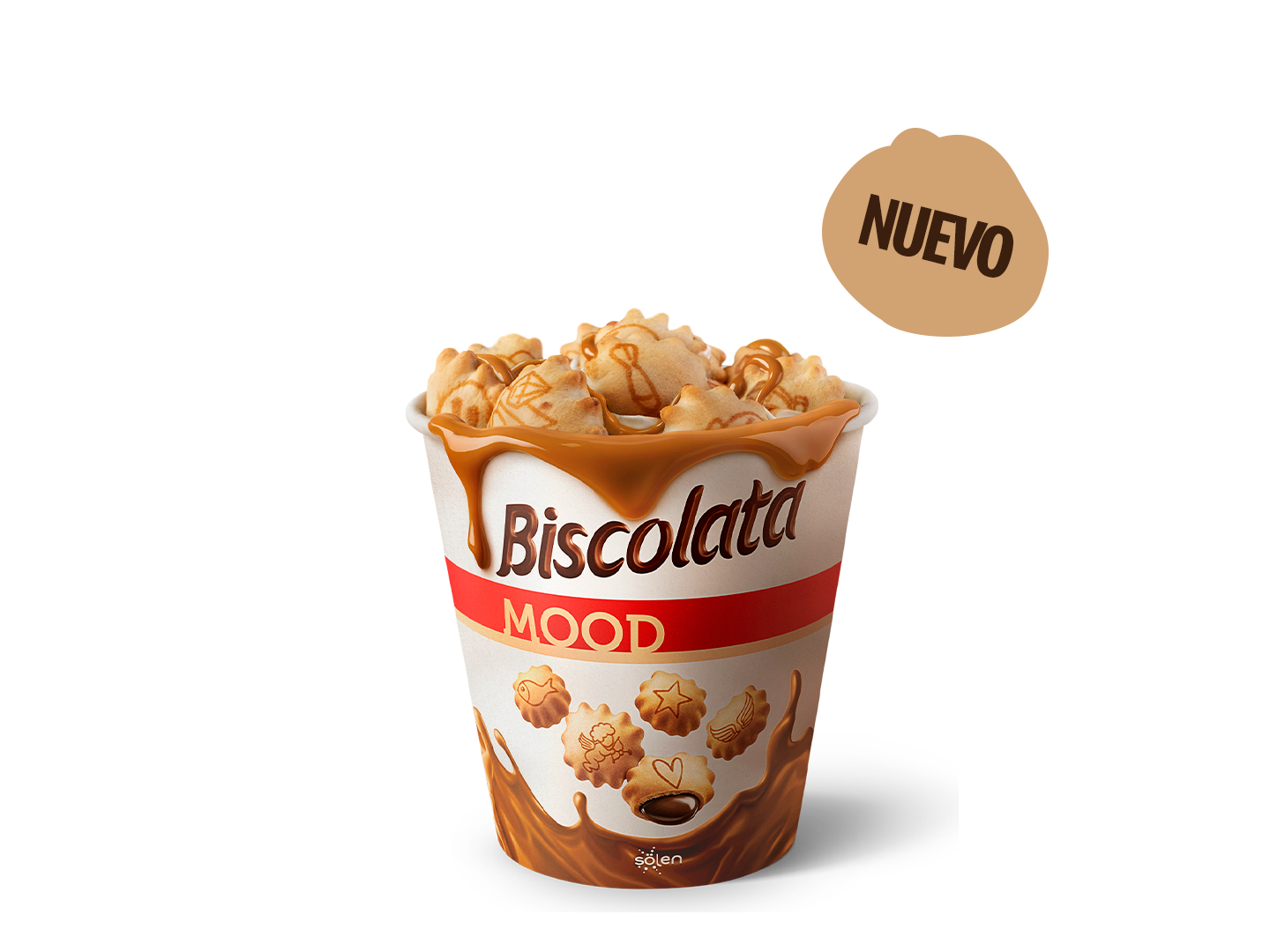 Helado de vainilla, galletas Biscolata rellenas con chocolate y crema de avellanas, con cobertura líquida de manjar. Tamaño personal. Imagen referencial.