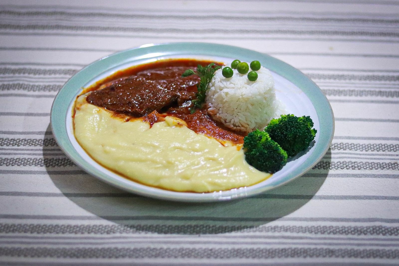 Carne 180 g acompañado de puré cremoso y porción generosa de arroz.