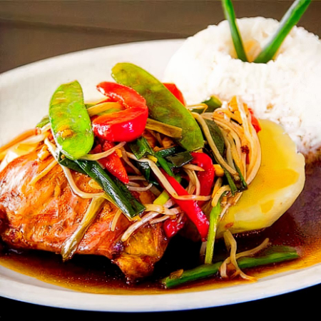 Pieza de pollo a elección, dorada con arroz y ensalada rusa y arvejas.