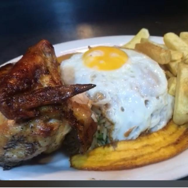Jugosa y enorme suprema de pollo con platanos y huevo frito acompañado de papas fritas y arroz blanco. .