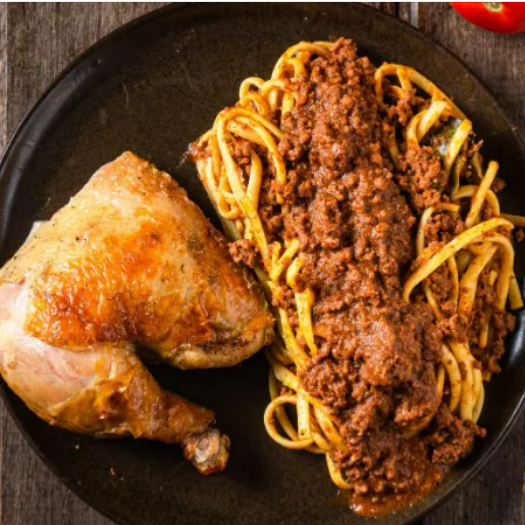 1/4 De pollo a la brasa acompañado de tallarines rojos de carne con entrada a elección.
