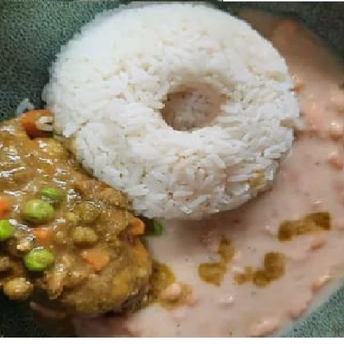 Arroz, puré, piña, jamón y queso, entrada y bebida a elección.