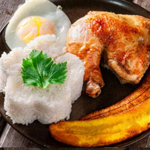 1/4 De pollo a la brasa acompañado de arroz blanco, huevo frito y platano frito, con entrada a elección.