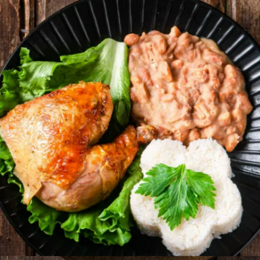 1/4 De pollo a la brasa acompañado de arroz blanco y frejol canario con entrada a elección.