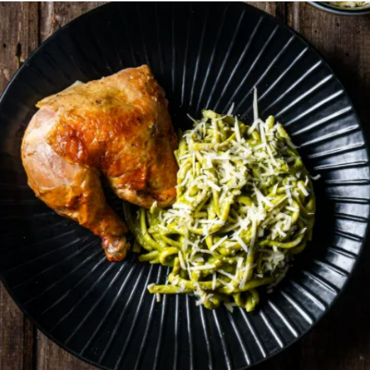 1/4 De pollo a la brasa acompañado de tallarines verdes y entrada a elección.