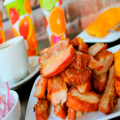 1/4kg de chicharron + camote frito + papas + choclo + salsa criolla + 2 bebidas a elegir.