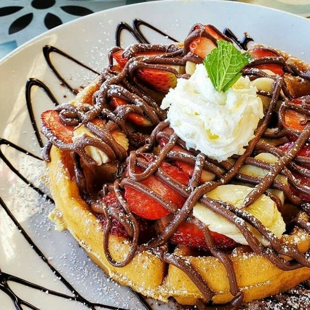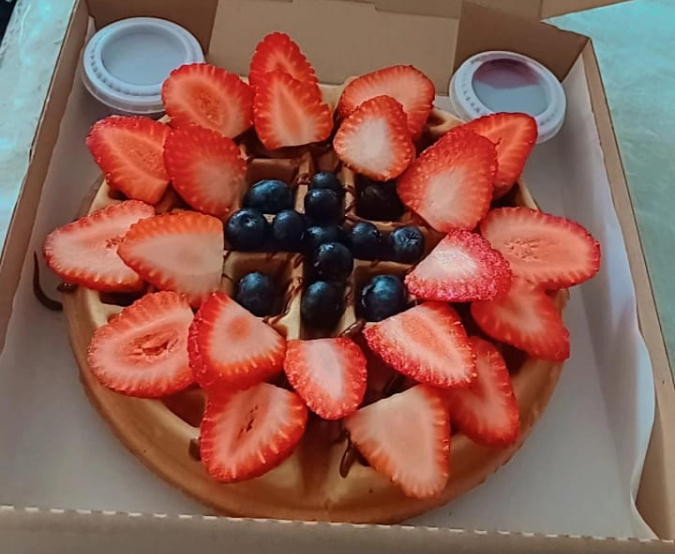 waffle con fresas, arandanos, oreo o chispas de chocolate y manjar o fudge.