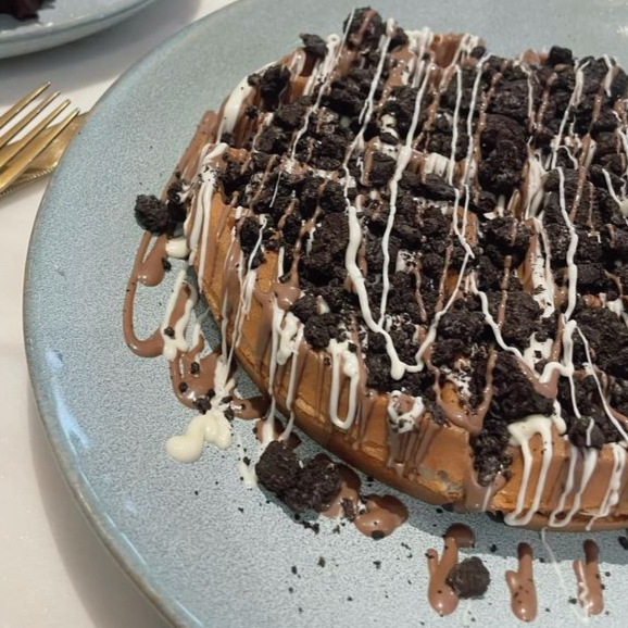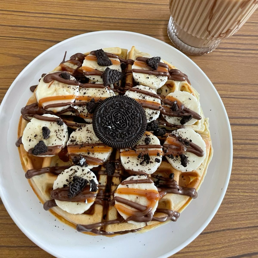 Waffle con manjar o fudge o crema pastelera y oreo