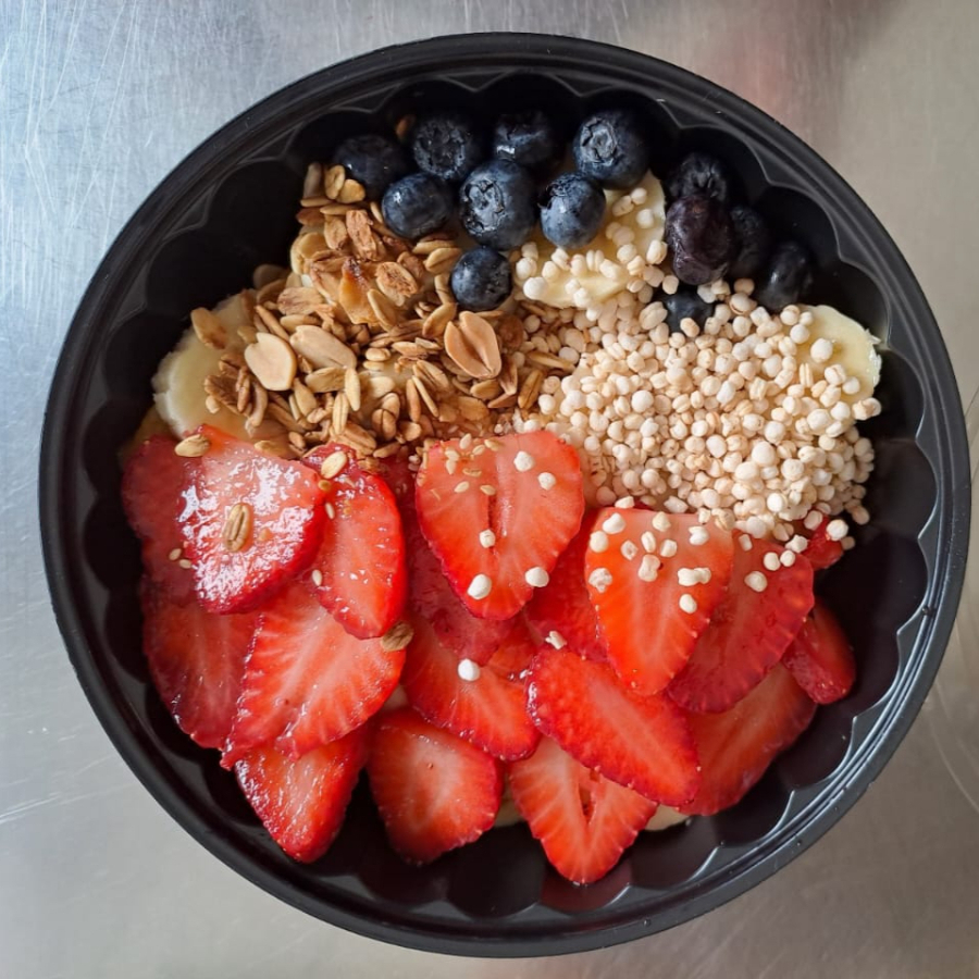 "Ensalada con platano, mango, papaya, fresa, arandano yogurt de vainilla o fresa con cereal pop algarobina y miel."