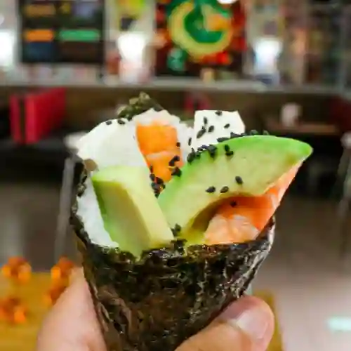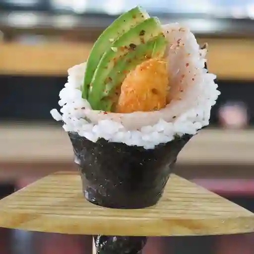 Cono de alga nori relleno de sakana furai, palta, trucha salmonada y salsa picante.