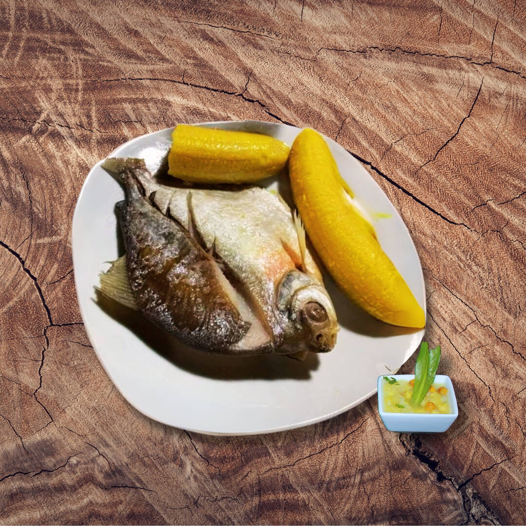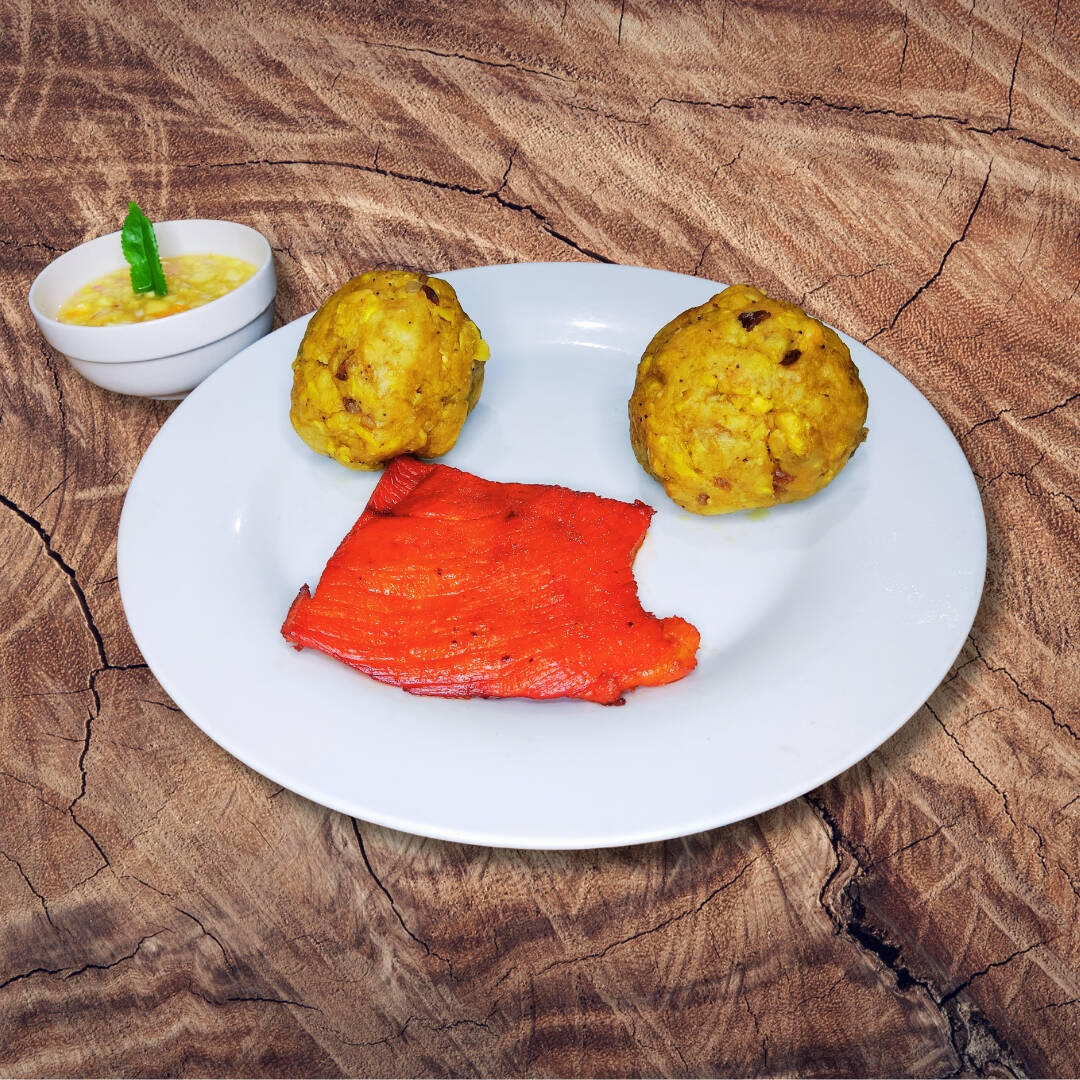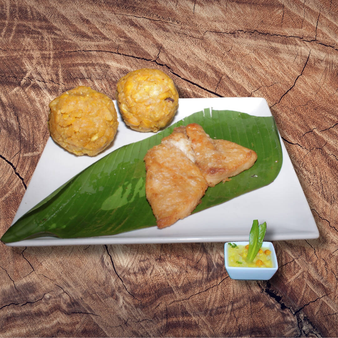 02 bolas de tacacho con filete de paiche frite con aji de cocona