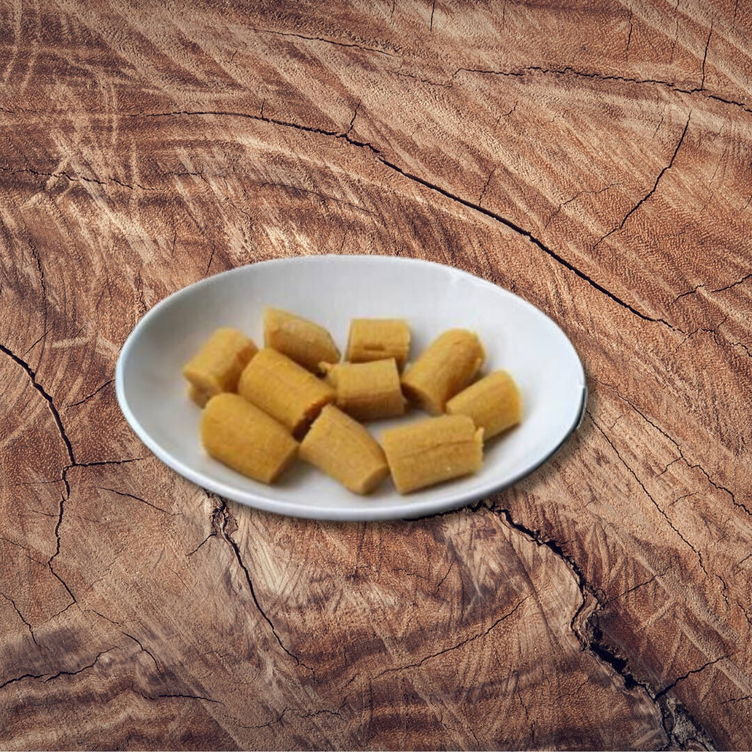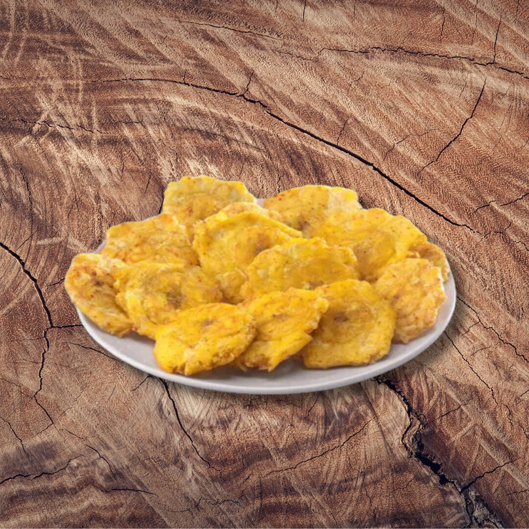 Platano verde frito , machacado con trozos de chicharritas de cerdo , manteca sal