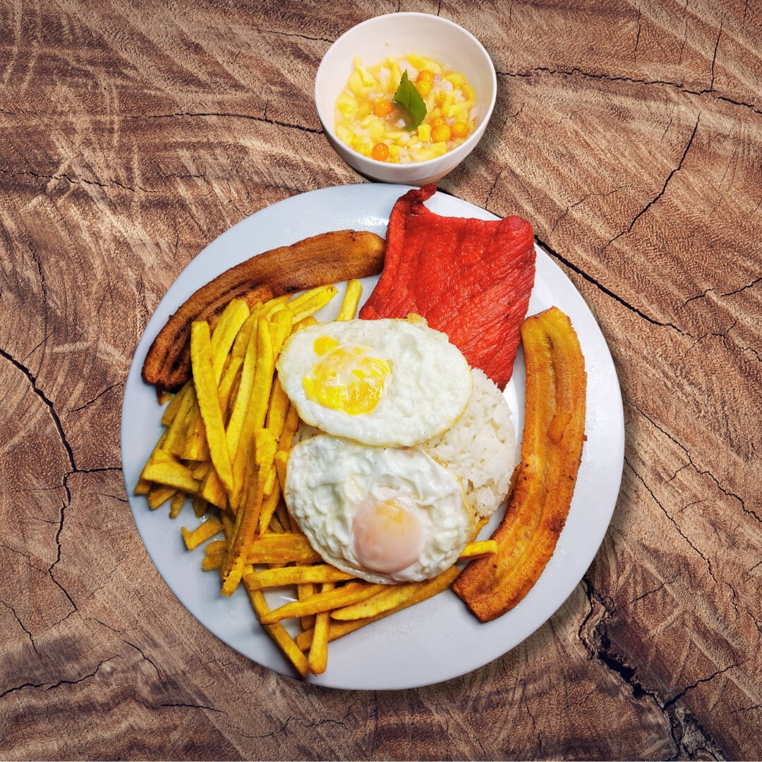Bisteck de cecina + maduro frito + huevo frito + arroz blanco + plátano verde frito al estilo papas fritas de pollería + ají de cocona