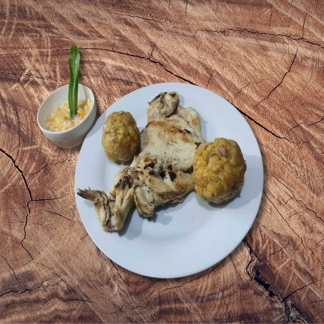 Pollo a la parrilla + 02 tacachos + ají de cocona