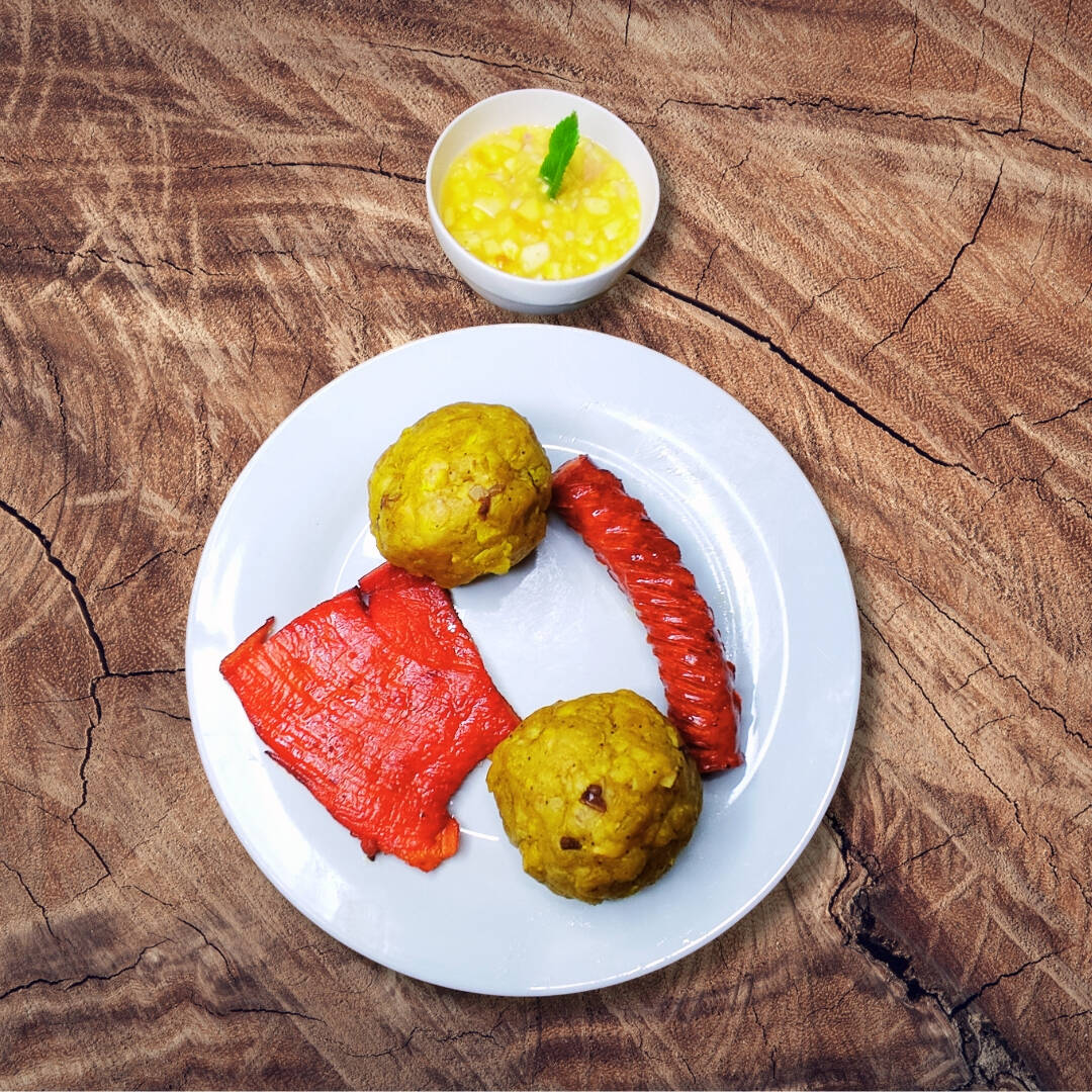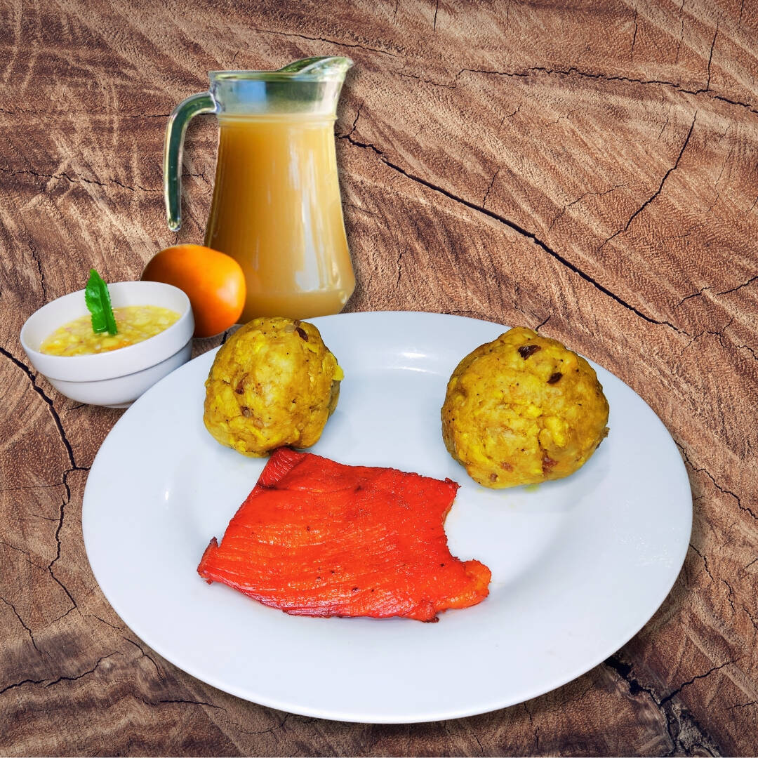 02 bolas de tacacho + porción de cecina + ají de cocona.
