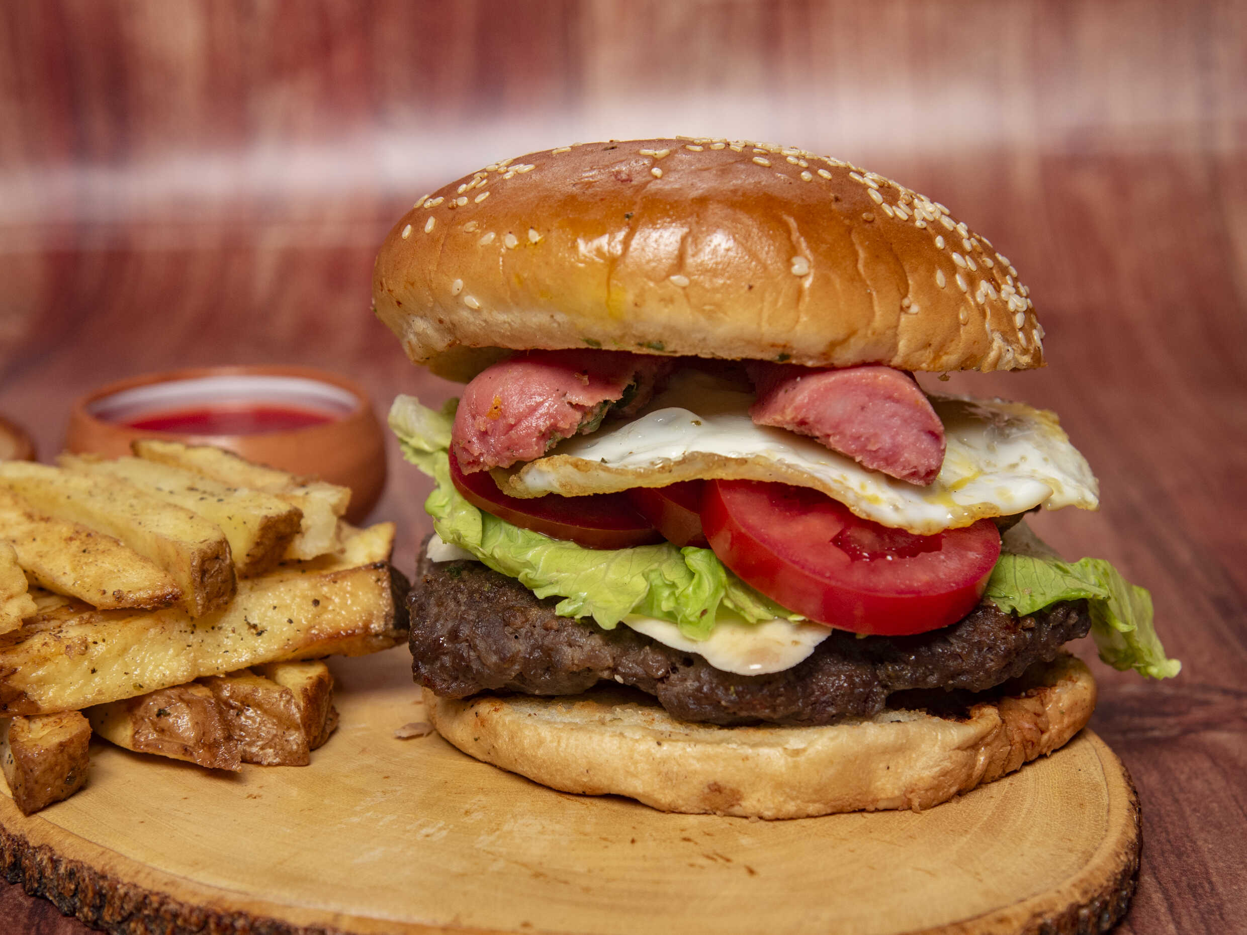 Hamburguesas de carne, huevo, chorizo y queso derretido, servida en una cama de vegetales frescos y acompañada de papas fritas.