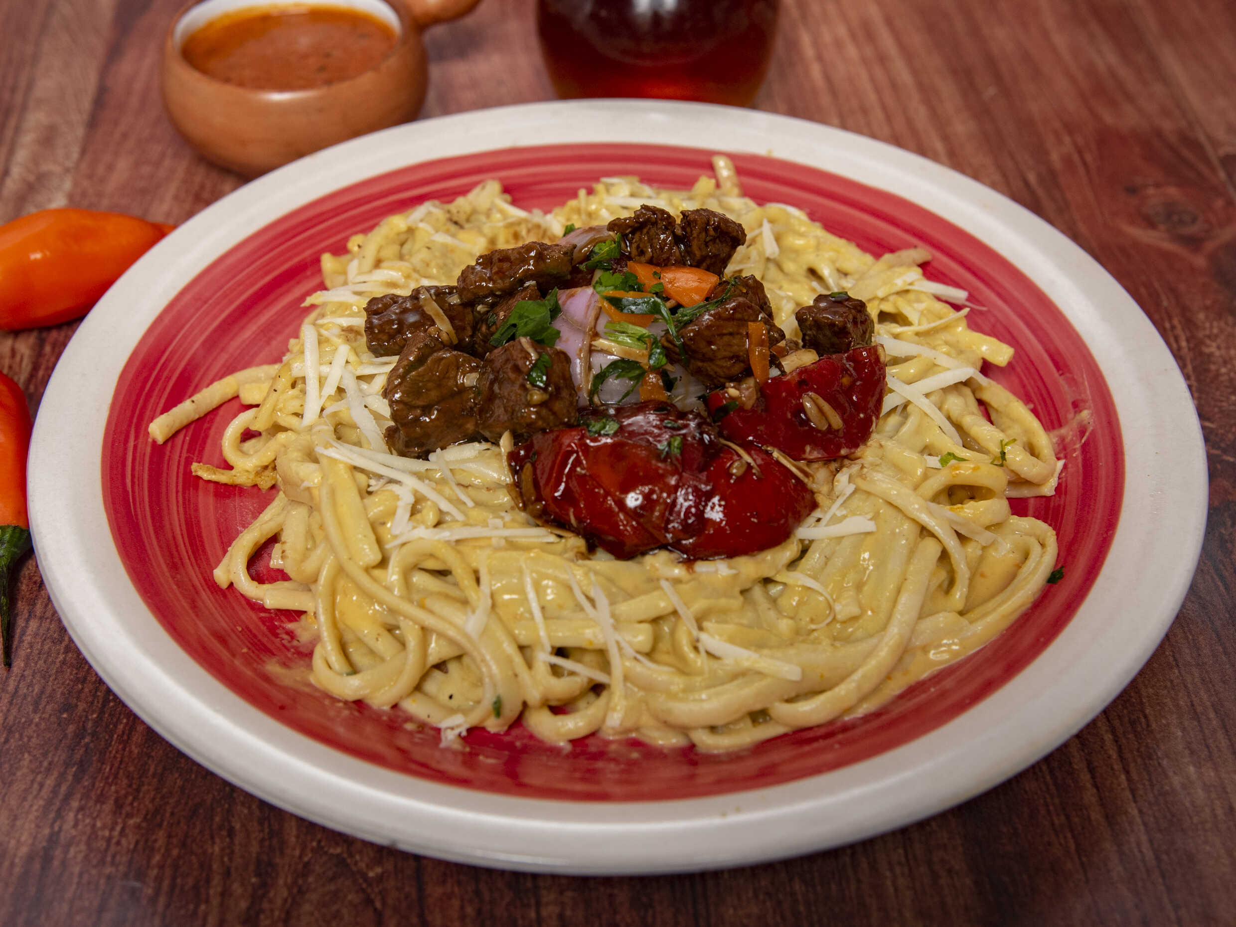 Pasta fetuccini embadurnada en una cremosa salsa huancaína, servida con un jugoso lomo saltado y una bebida a elegir.
