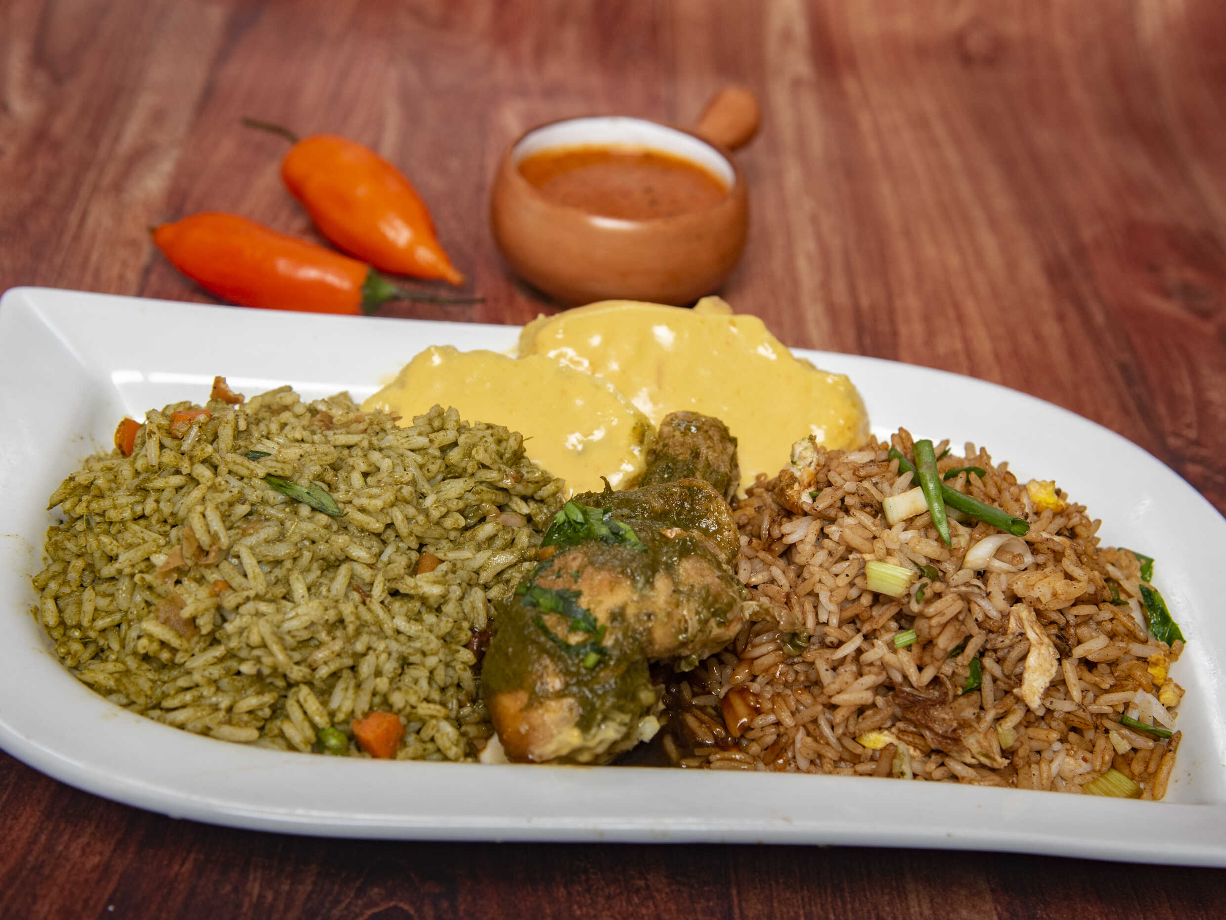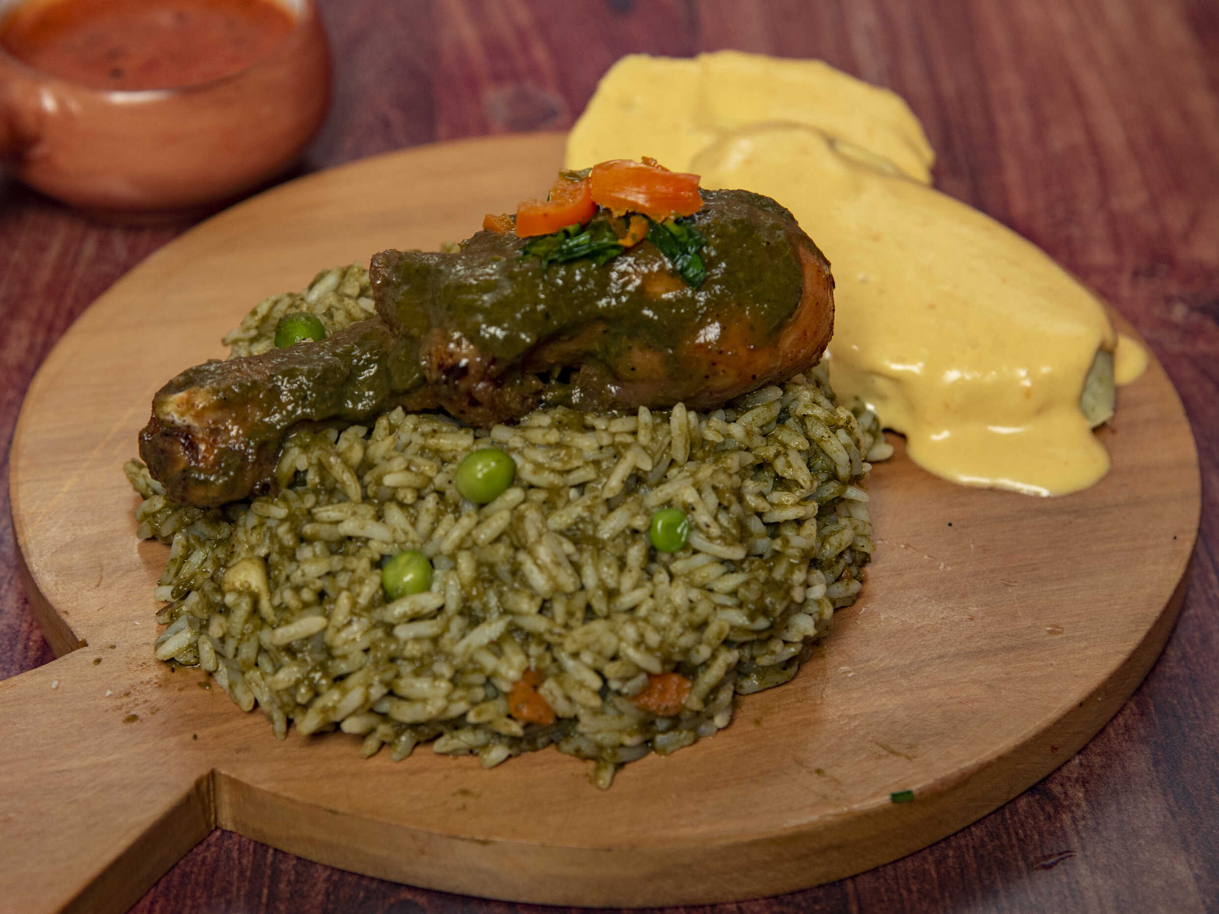 Tradicional arrocito verde con su pollito servido con chaufa flameado al wok y acompañado con papa a la huancaína.