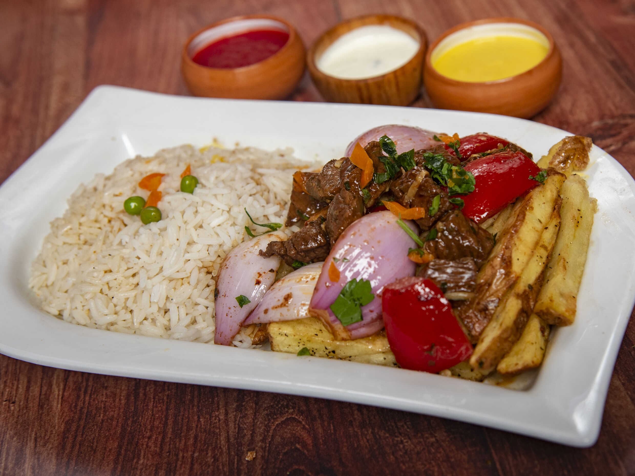 Jugoso Lomito Saltado al Wok. Servido con Crocantes Papitas Fritas y Arroz Graneadito. Incluye una bebida a elegir y una entrada.