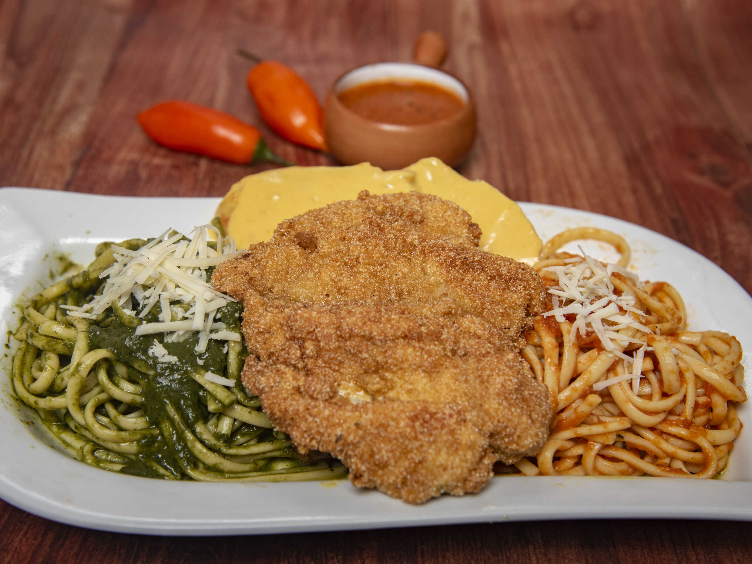 Tallarines al pesto acompañados con tallarines en salsa roja, servidos con papa a la huancaína y una sábana de milanesa 100% casera.