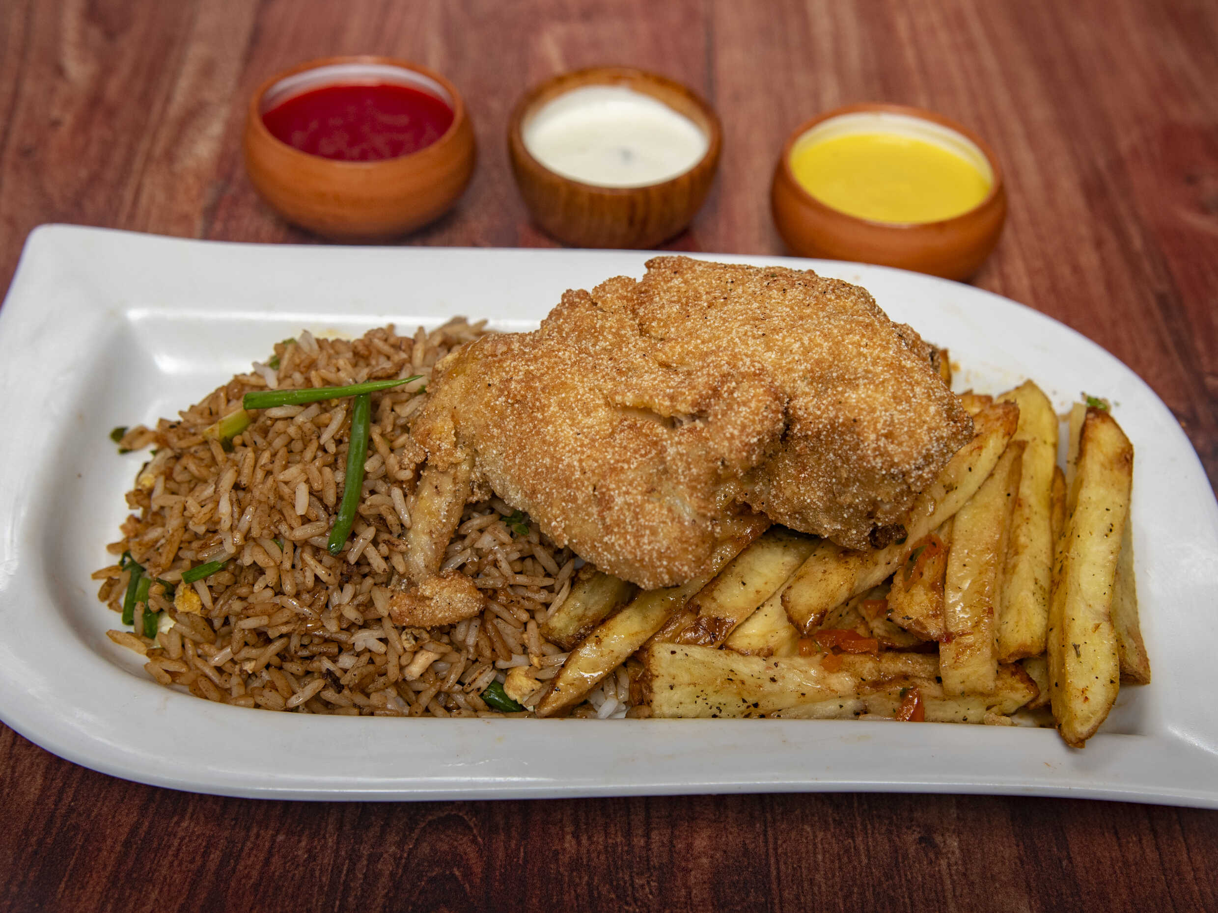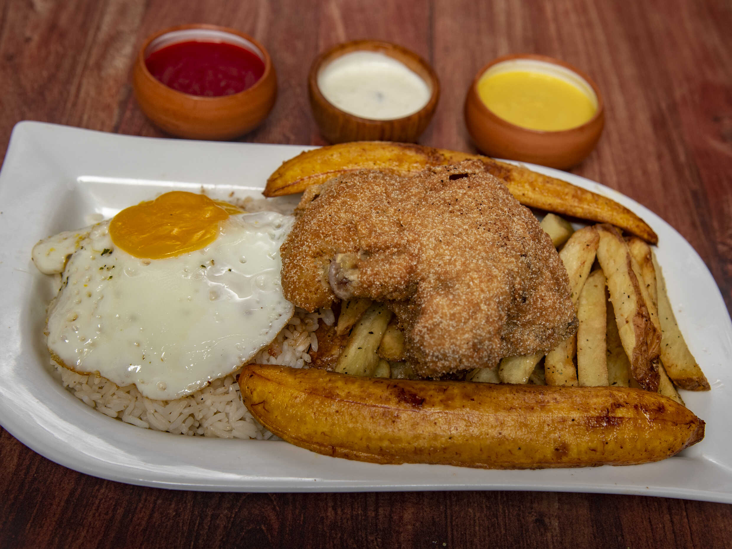 Crocante pollo broaster acompañado de plátano frito, huevo frito, papas fritas, arroz graneado y una bebida a elegir.