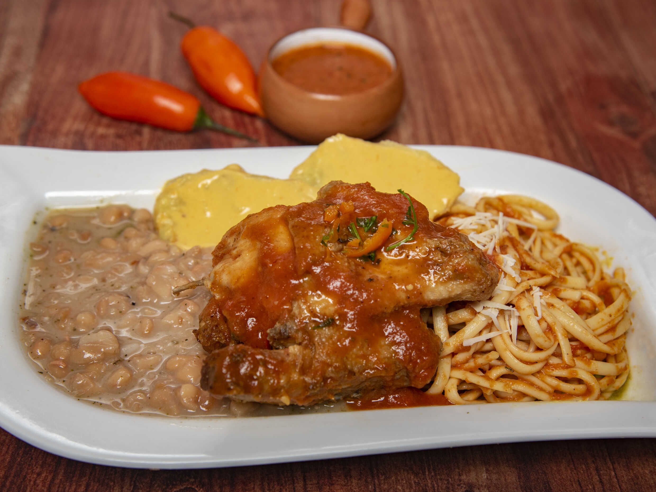 Tallarines embadurnados en salsa roja junto a su pollito, servidos con cremosos frejoles y acompañados con papa a la huancaína.