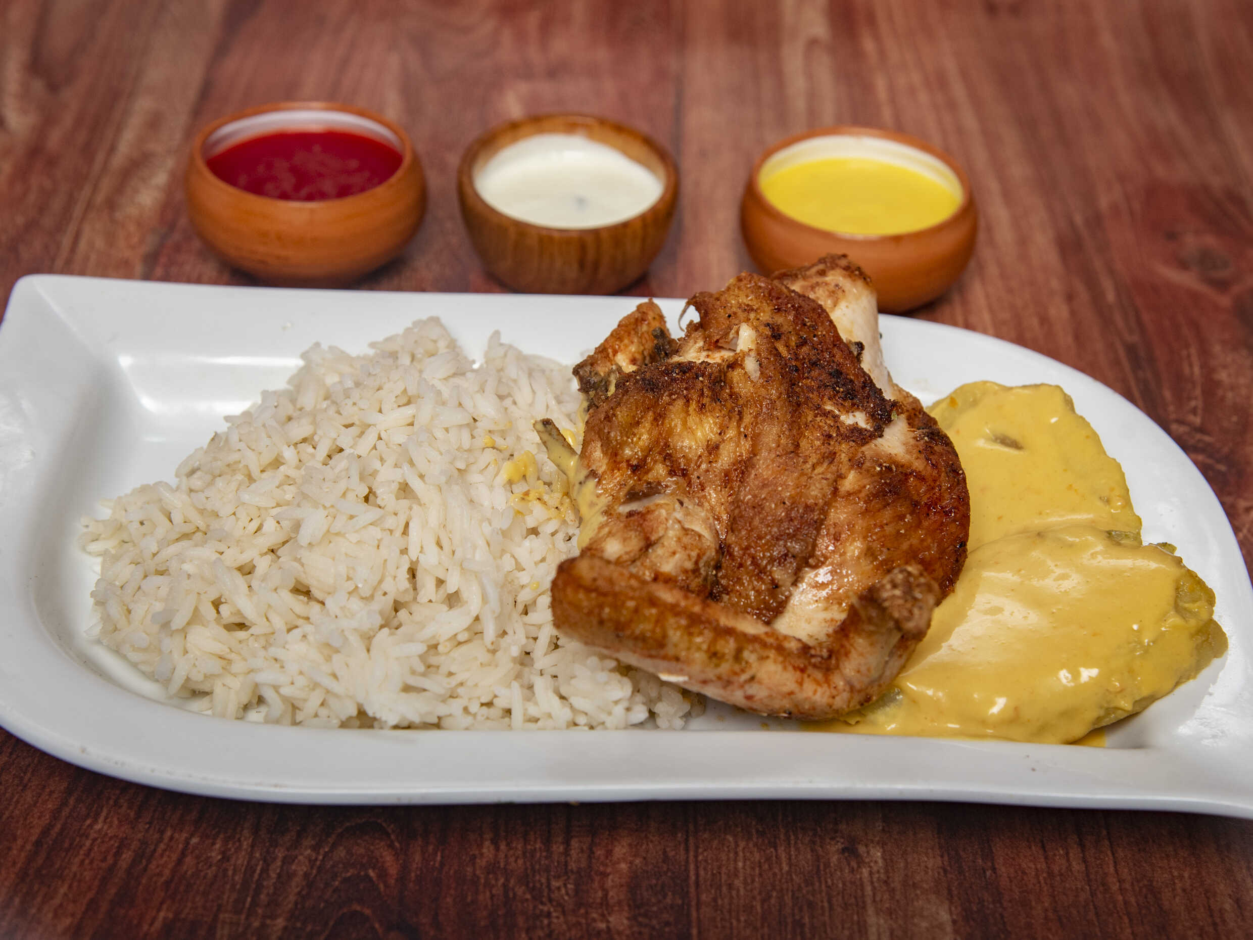 Pollada (parte pierna con muslo) acompañada de arroz graneado y papa a la huancaína. Incluye una bebida a su elección.