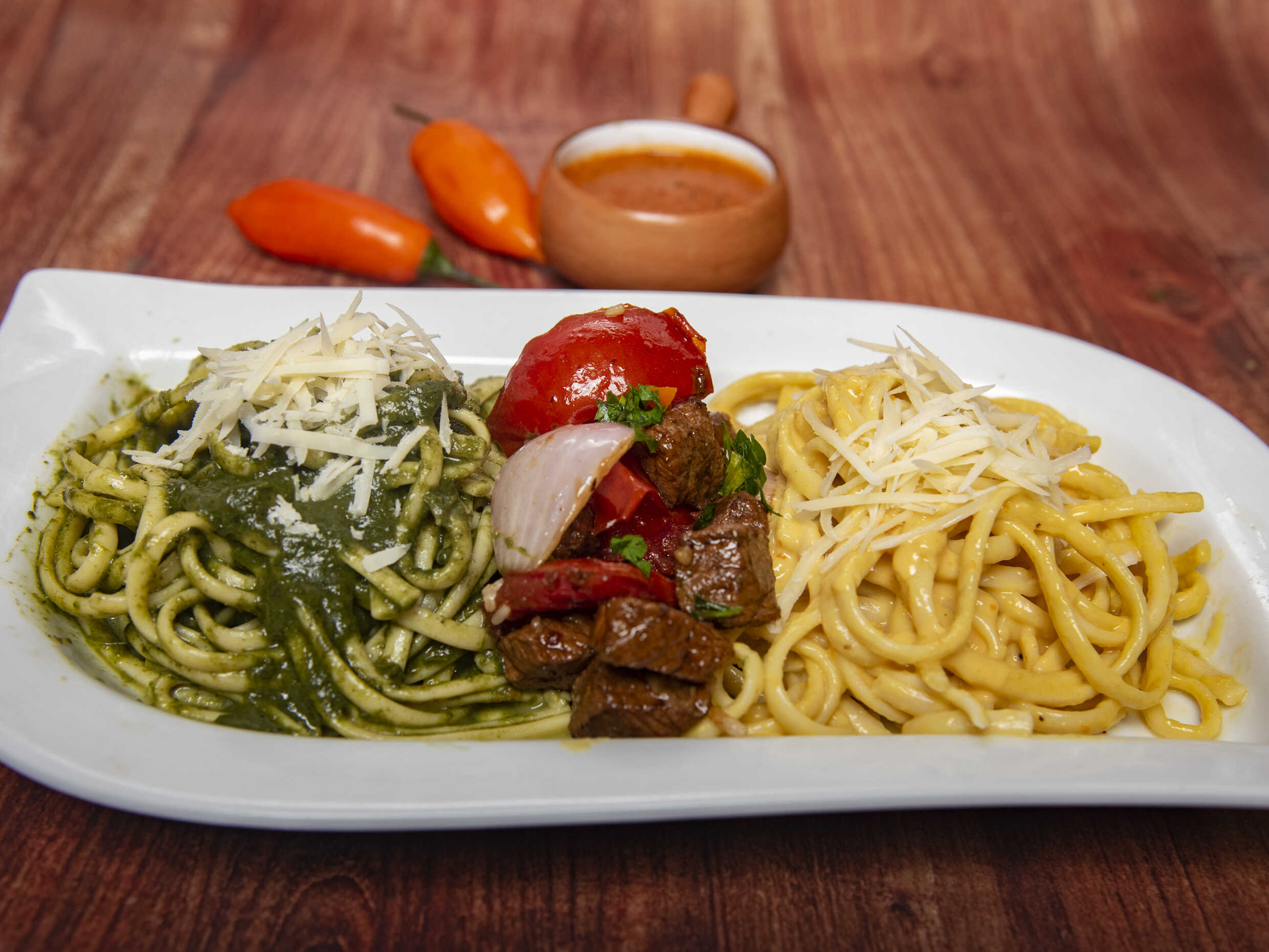 Tierno lomito saltado al wok servido junto a los infaltables tallarines al pesto y el tallarín a la huancaína.