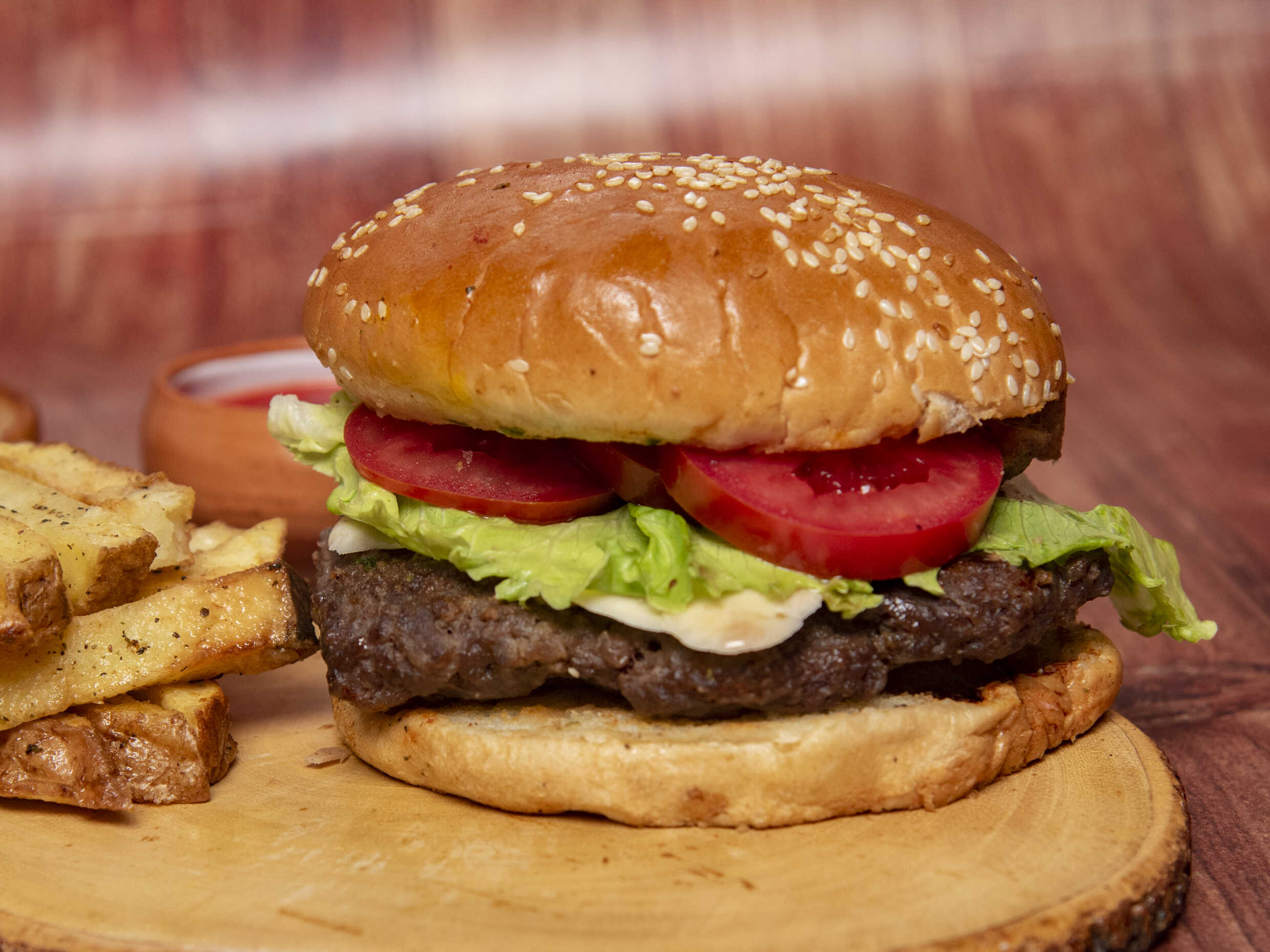 Hamburguesa de carne con queso, servida con vegetales frescos, papas fritas crocantes y salsas a elección.