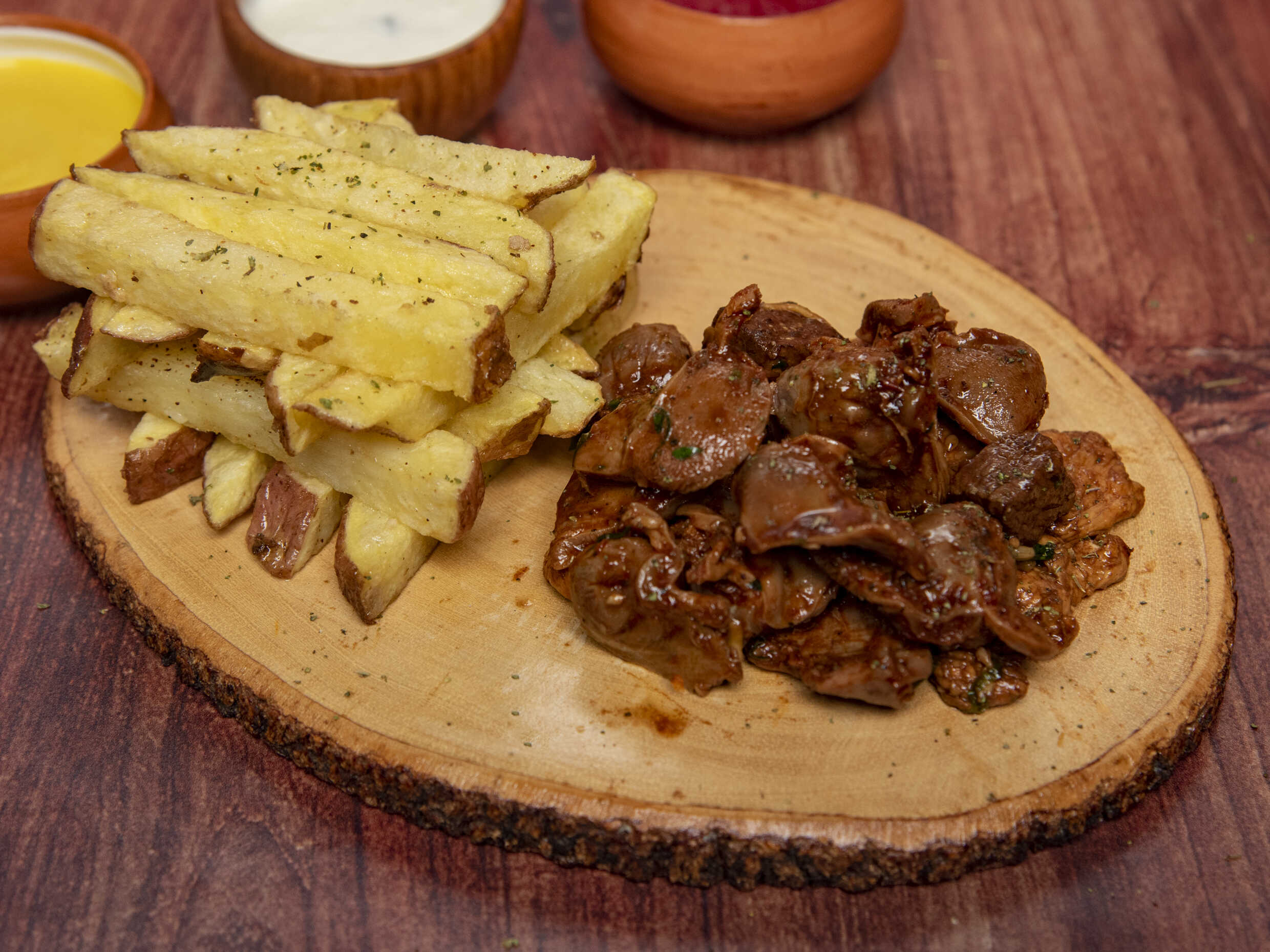 Mollejitas a la parrilla servidas con papitas a tu elección.