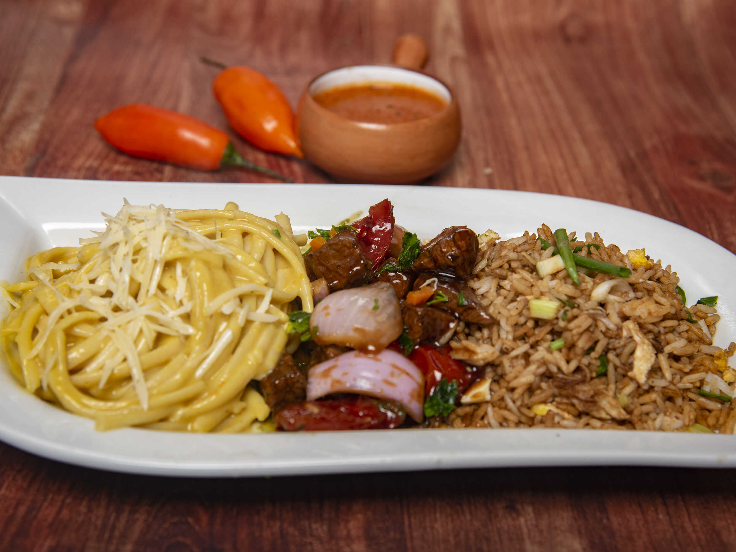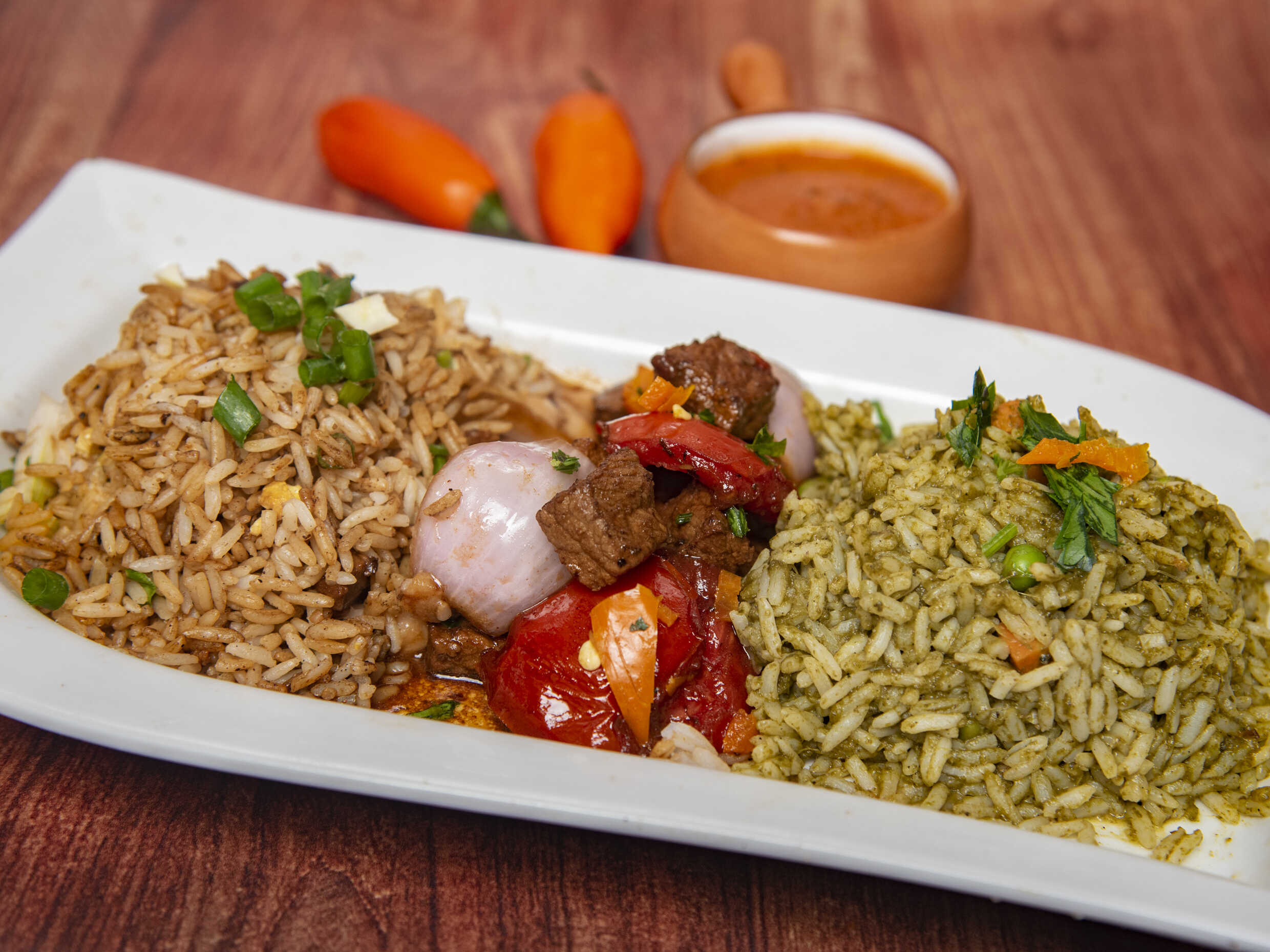 Tierno lomito saltado al wok servido con su arrocito chaufa y su tallarincito a la huancaína.