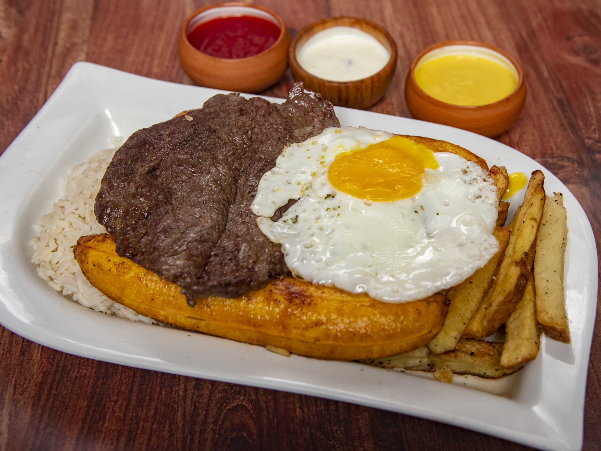 Jugoso bistec servido con plátano, huevo y papas fritas acompañado de arroz graneado. Incluye una bebida a su elección.