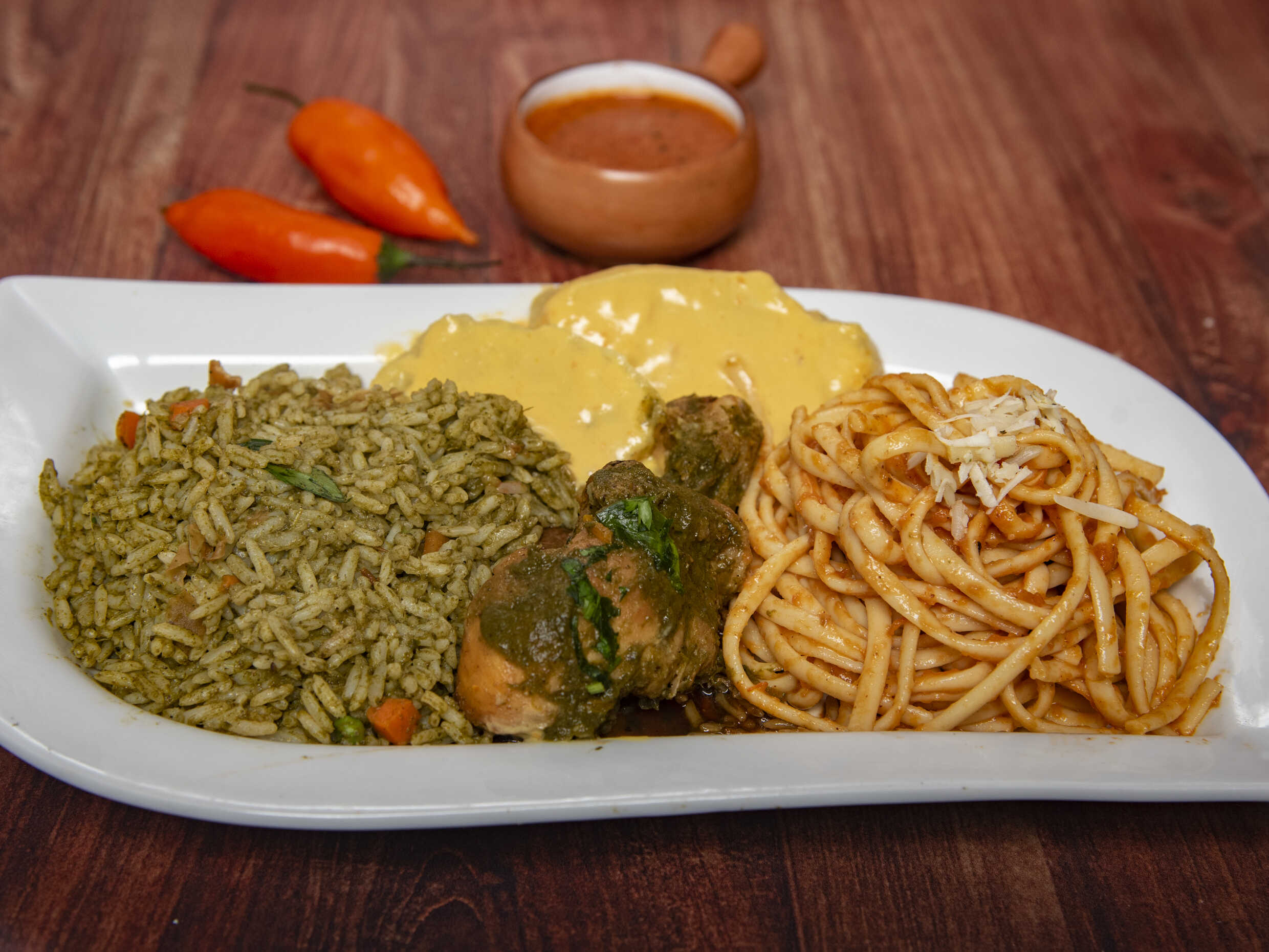 Tradicional arrocito verde con su pollito servido con tallarines embadurnados en salsa roja y acompañados con su infaltable papa a la huancaína.
