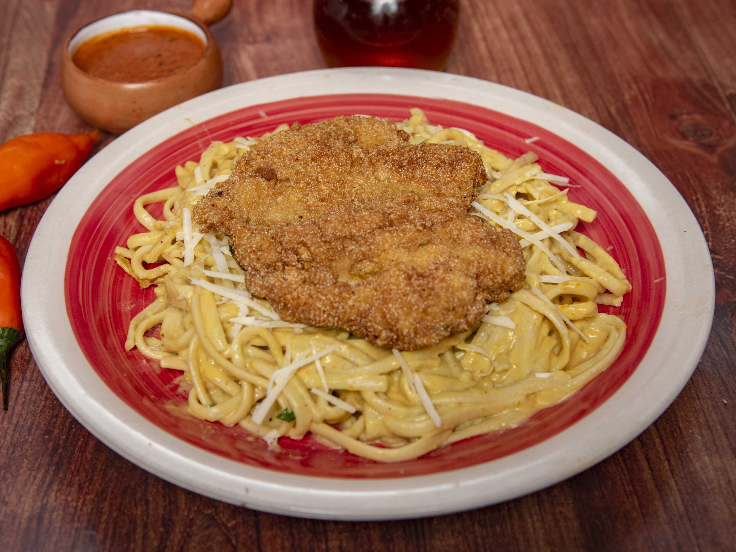 Pasta fetuccini embadurnada en una cremosa salsa huancaína, montada con una sábana de milanesa. Incluye una bebida a elegir.