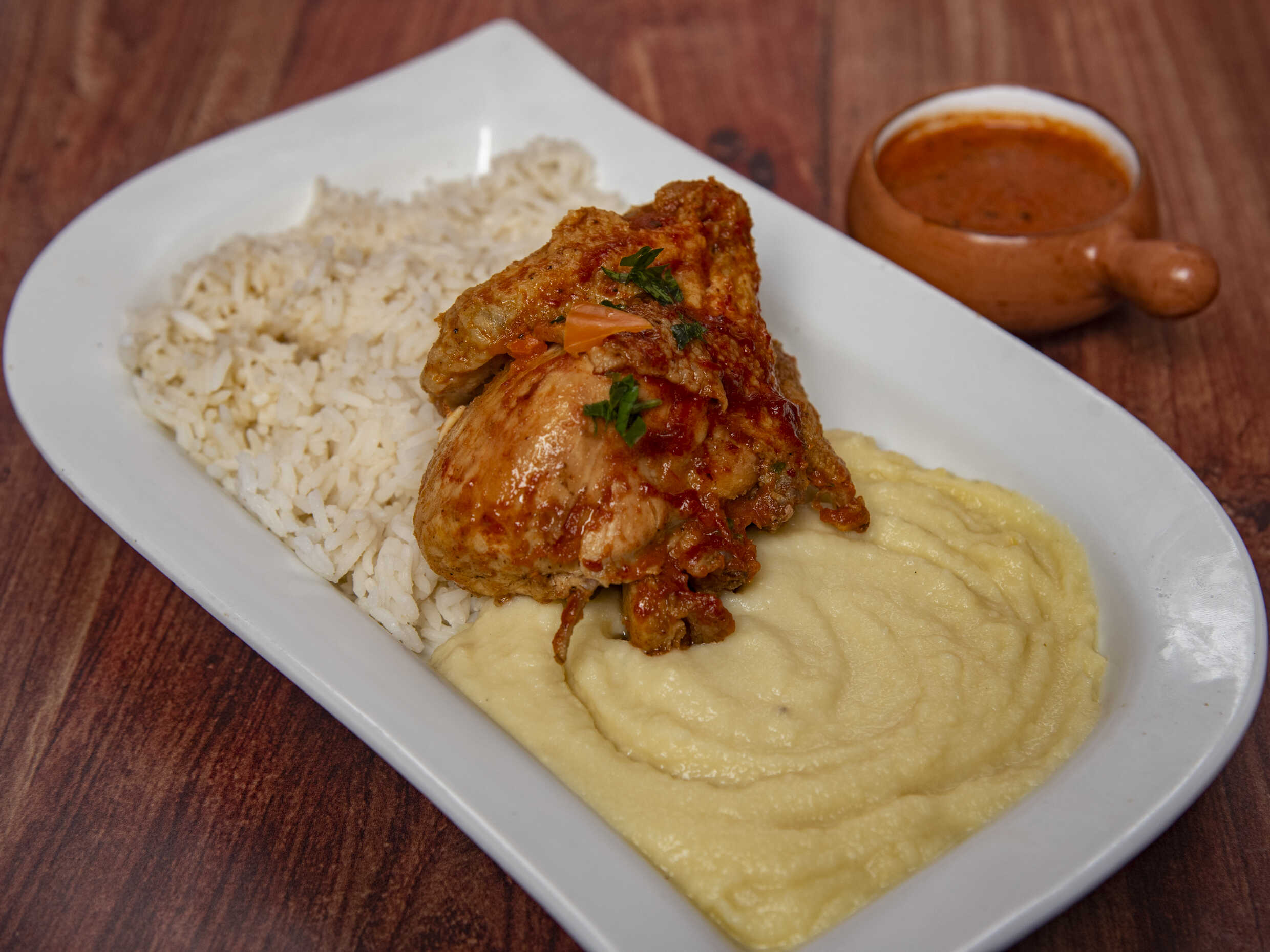Puré de papas acompañado con adobo de pollo y arroz graneado. Incluye una bebida a su elección.