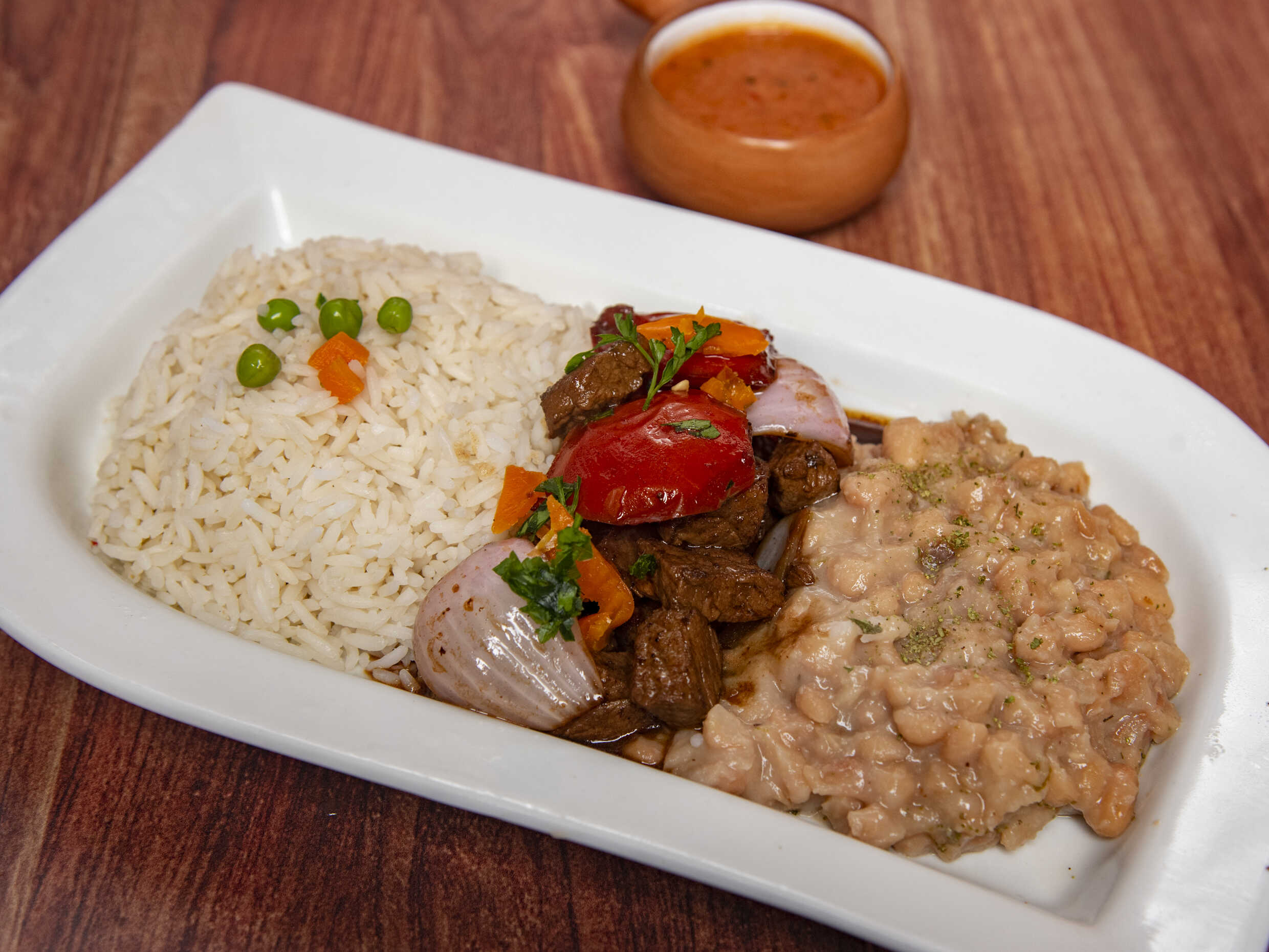 Tierno lomito saltado al wok servido con cremosos frejoles y arrocito blanco graneado.